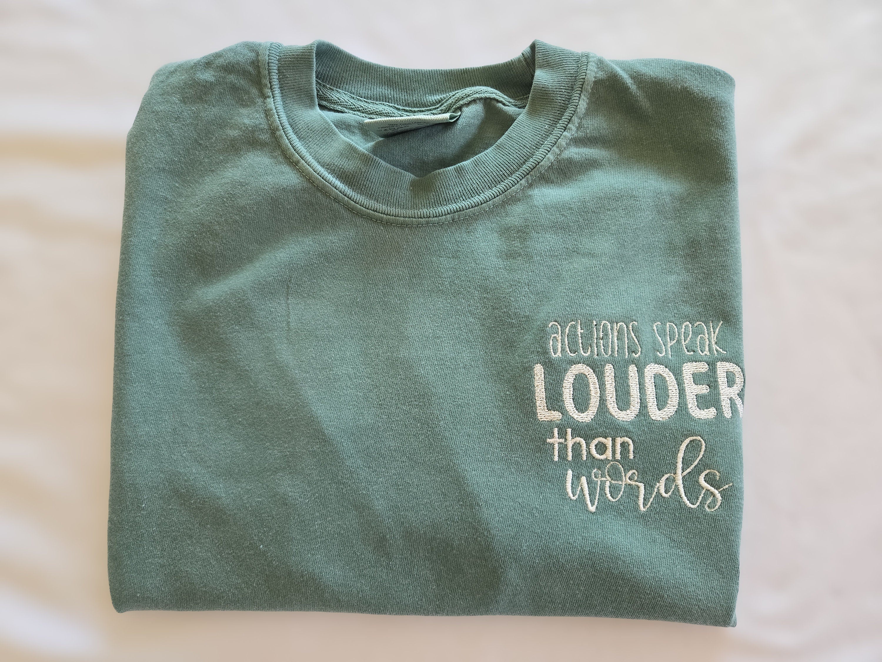 Actions Speak Louder than Words t-shirts made on Comfort Colors tees.