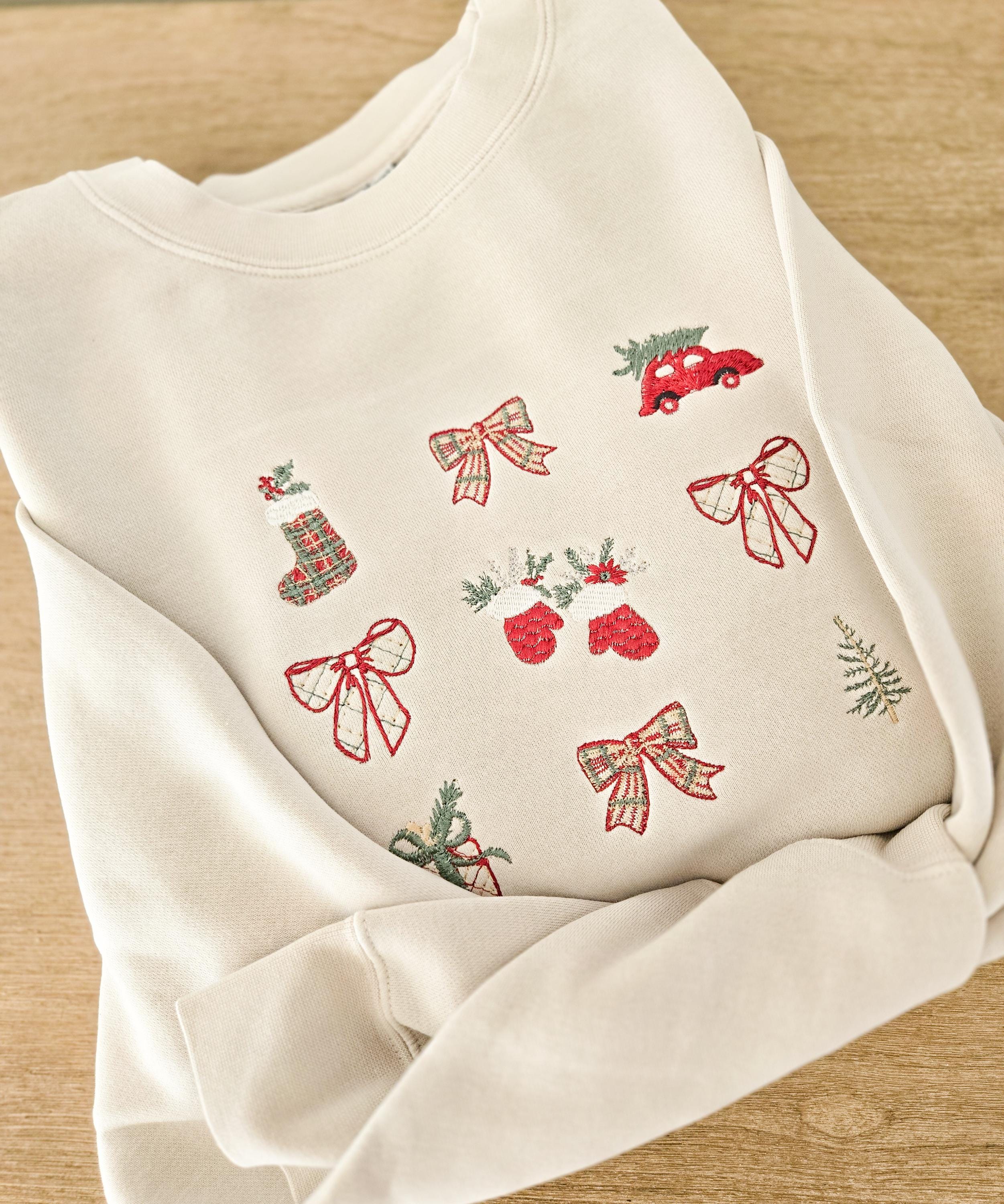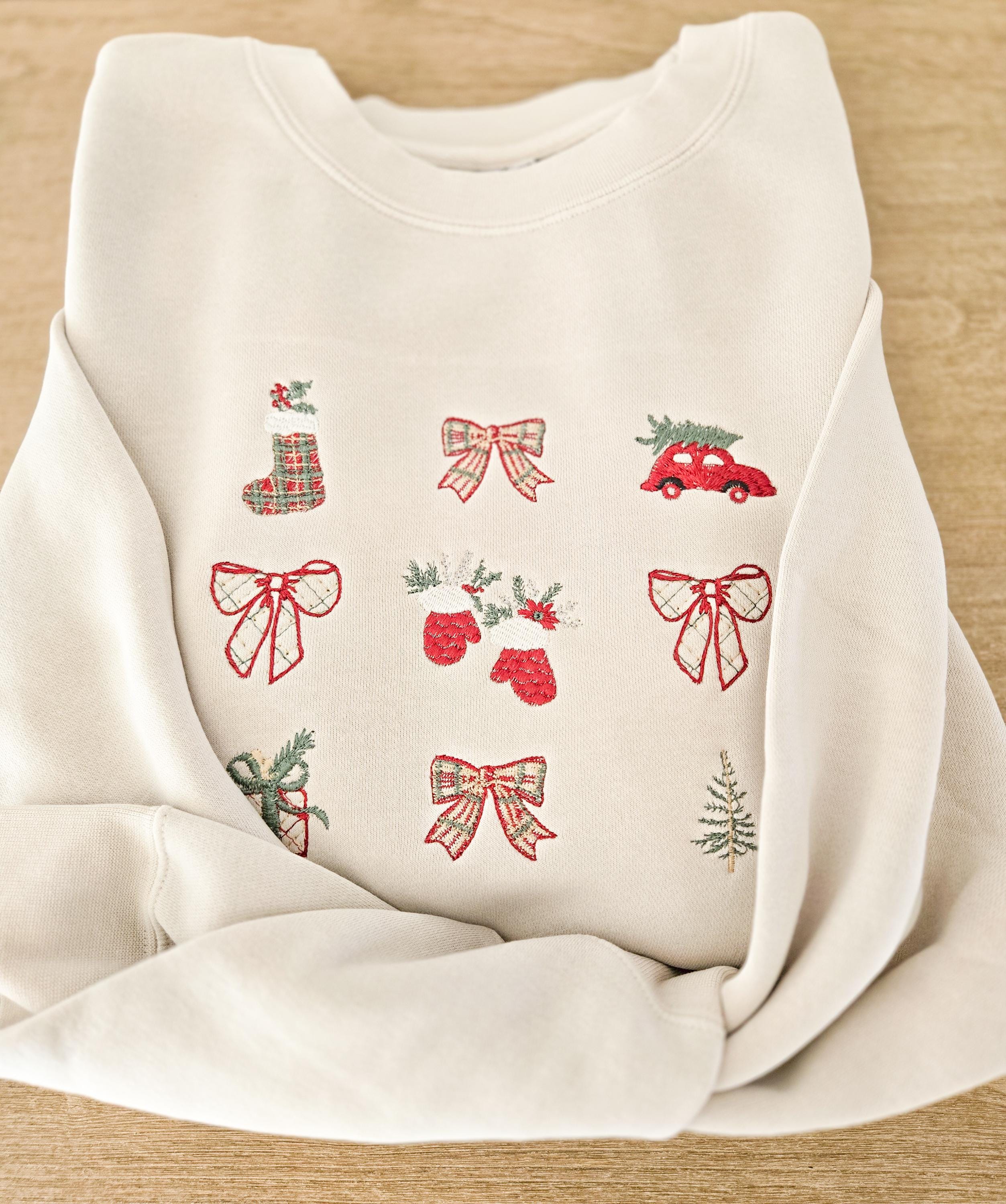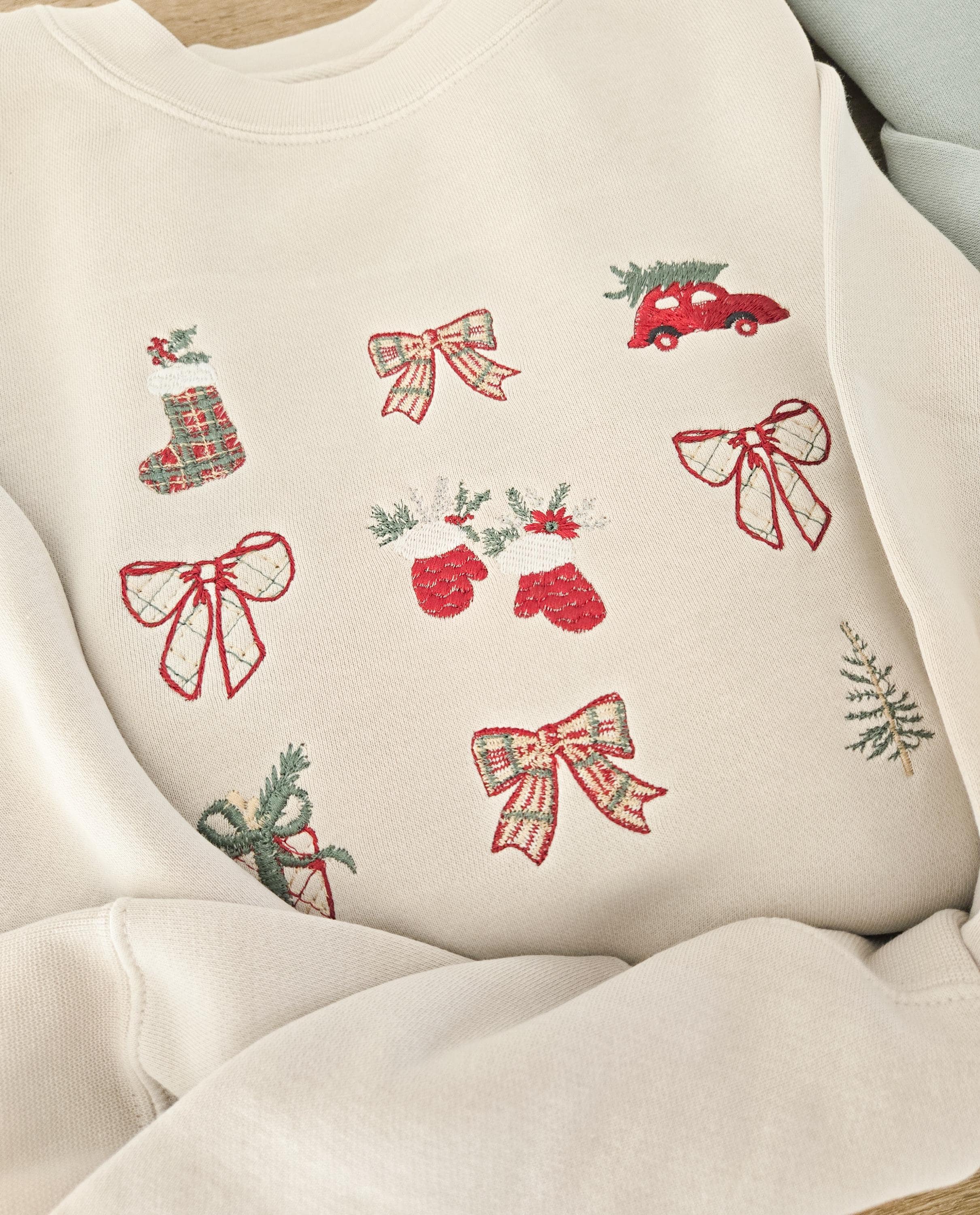 These adorable sweatshirts feature the trendy bow aesthetic with some Christmas items such as a Christmas tree, gloves, stocking and and gift.