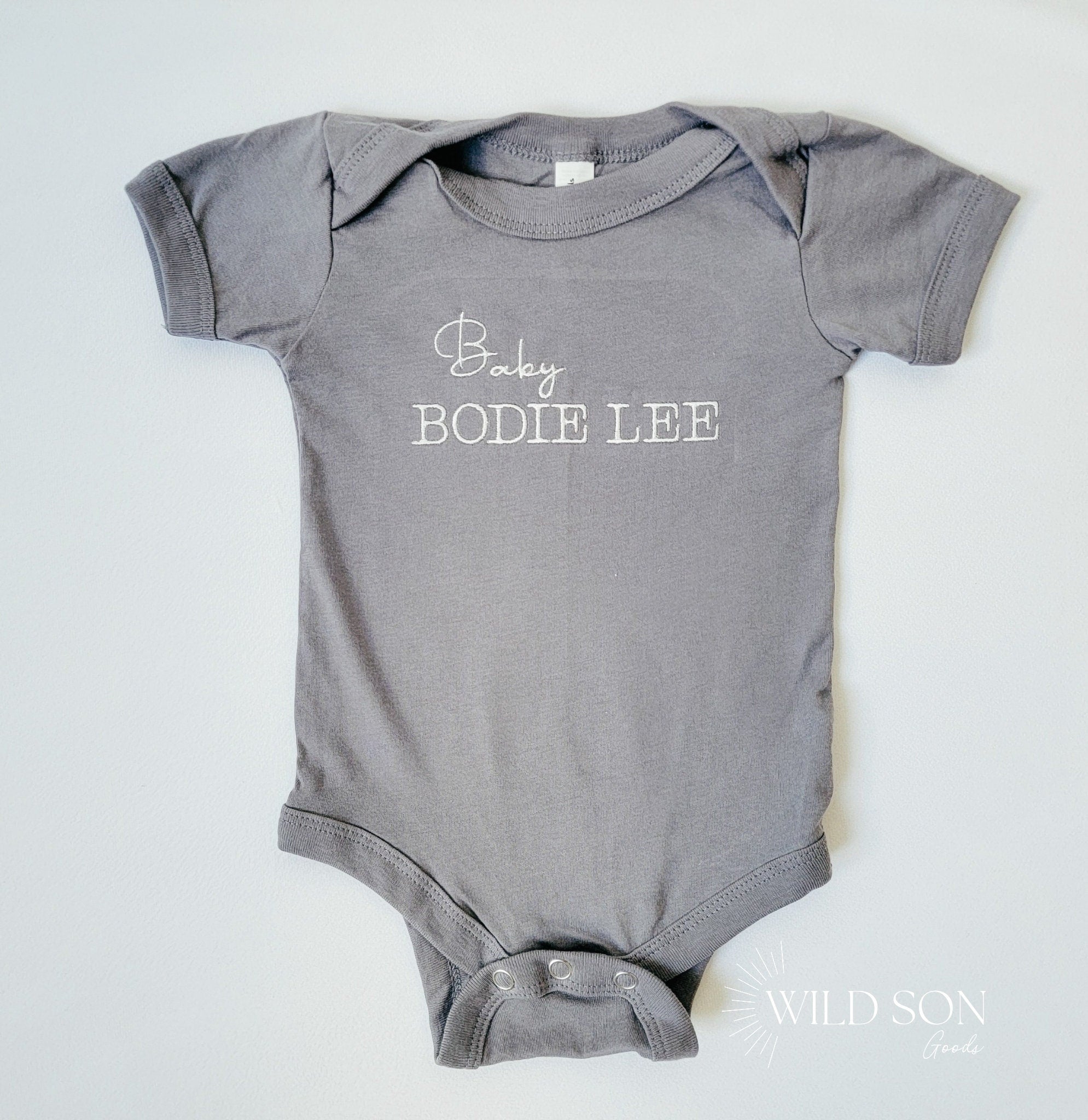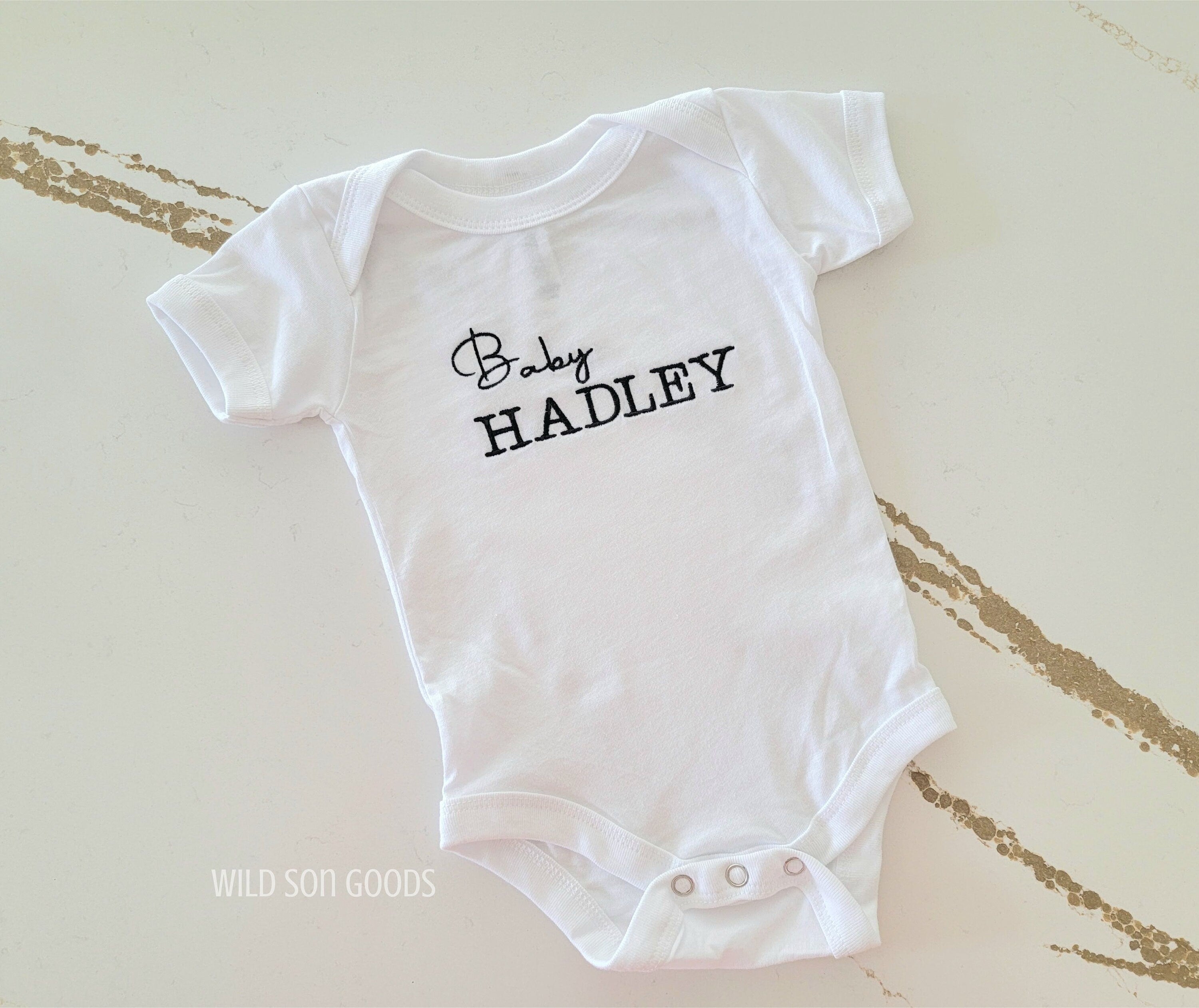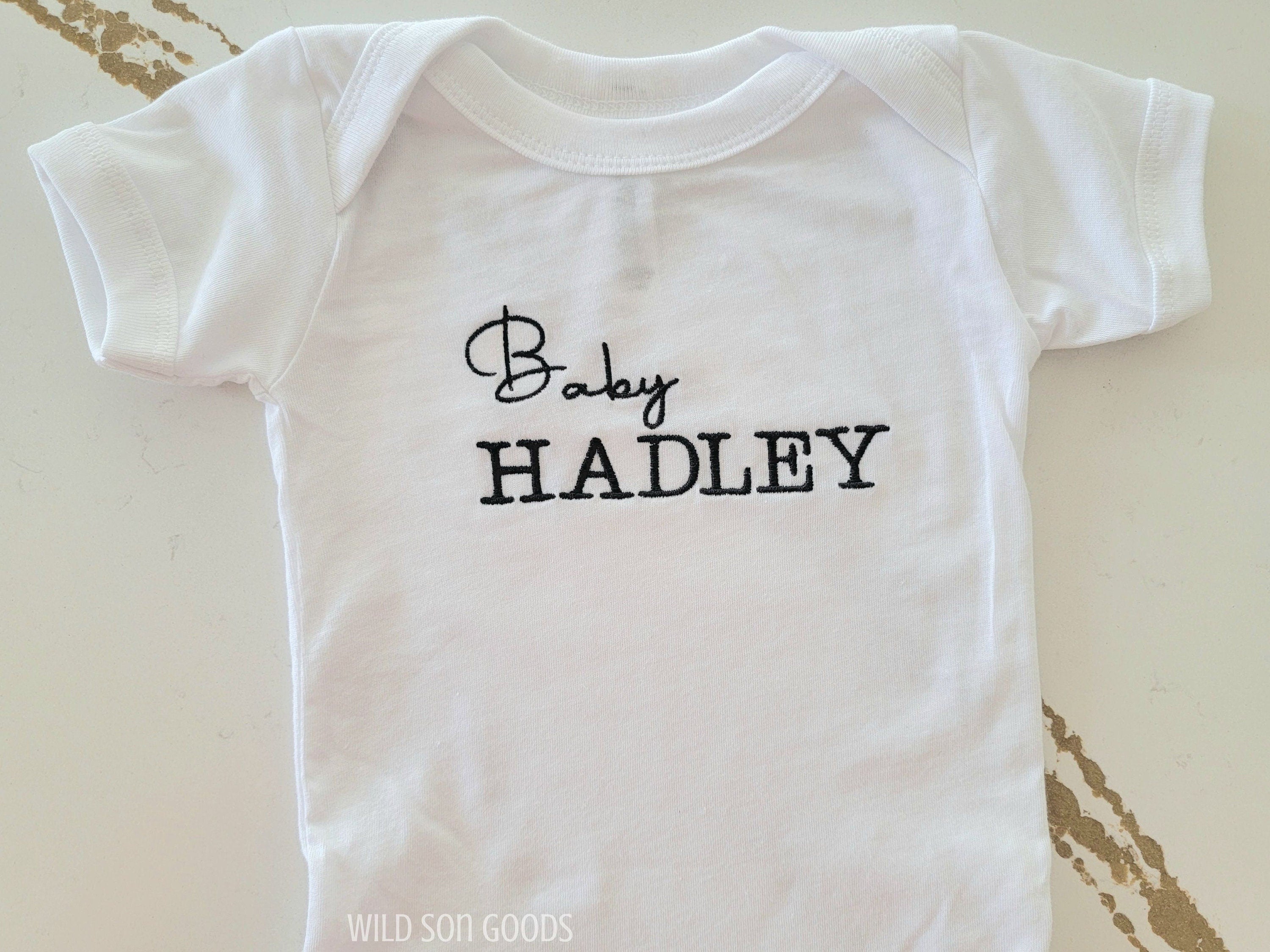 Custom Embroidered These bodysuits are 100% cotton, lightweight and super soft! Fully customize with babies name so this will read "Baby (babies name)". Great for announcements, coming home outfits, or just because!