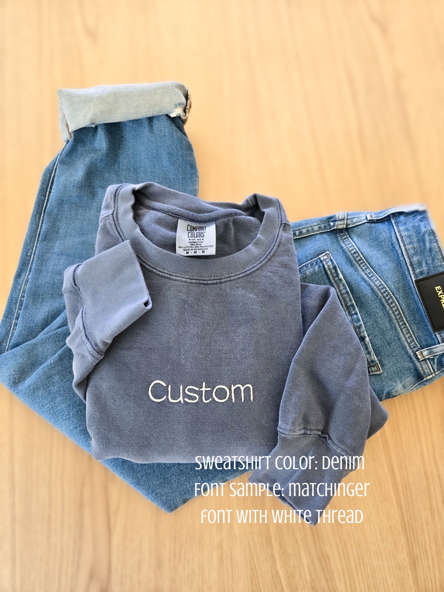 Custom embroidered in the center of the sweatshirt. Depending on the length of what you want this to say, embroidery may take up more than 1 line. Choose from many fonts and thread colors. Great Gift for him or a gift for her!