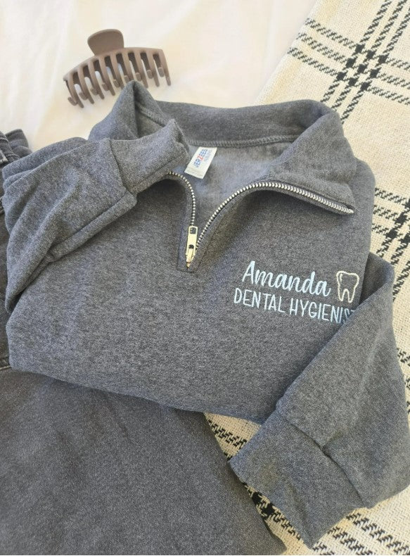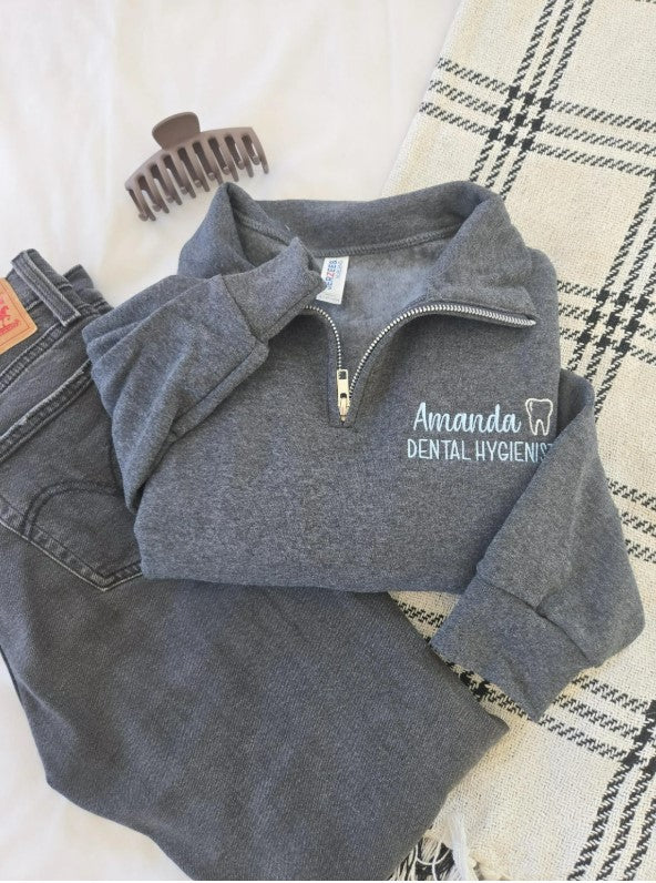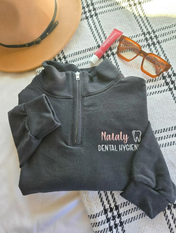 This custom embroidered dental hygienist quarter-zip sweatshirt is the perfect blend of professionalism and comfort. Featuring your name, a subtle tooth design, and your job title, this sweatshirt offers a personalized touch that reflects both your career and your style. With a wide selection of thread colors available, you can customize each piece to suit your preference. Ideal for individual wear or as a coordinated look for the entire dental office, this sweatshirt combines functionality with a personalized, polished appearance.