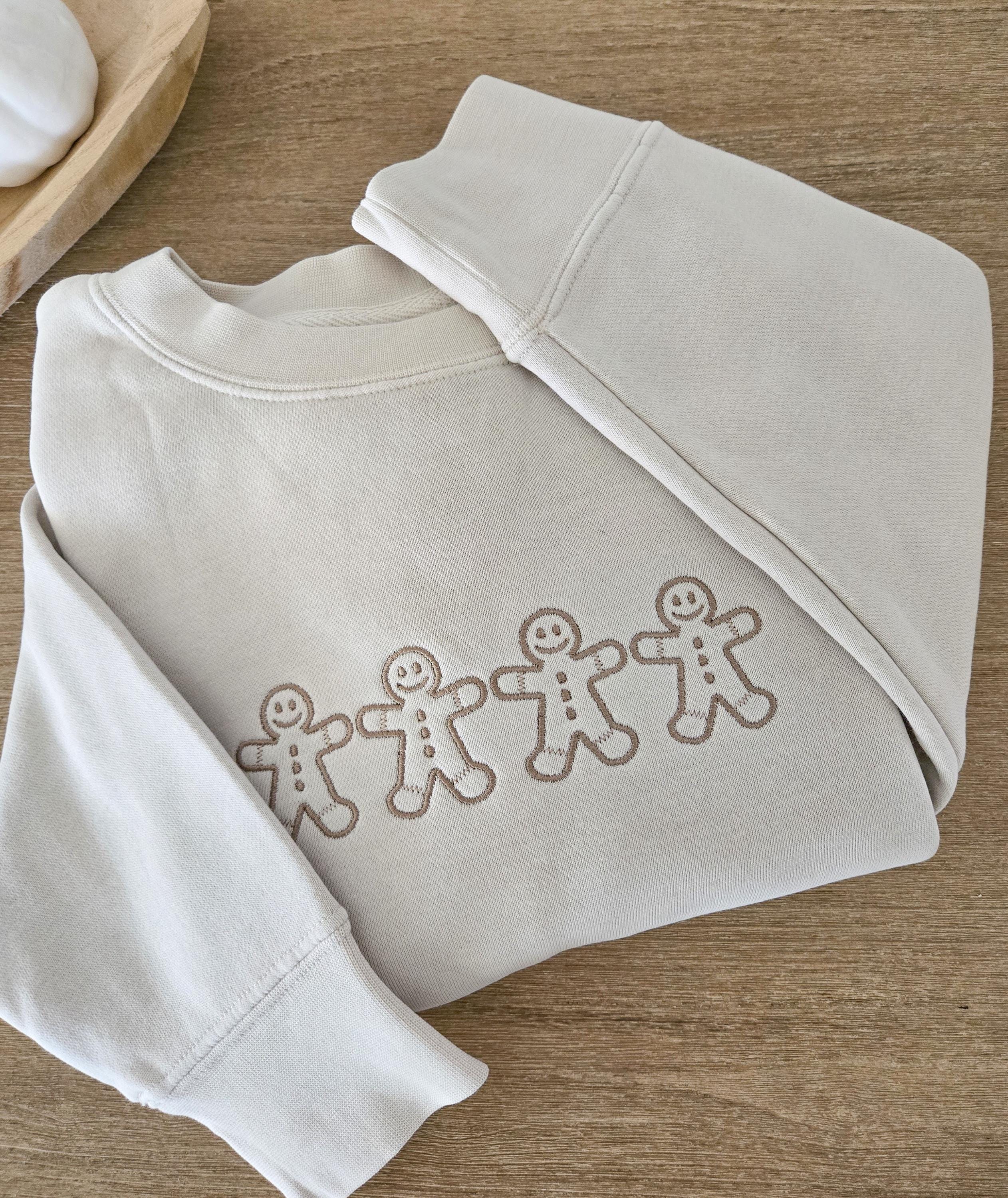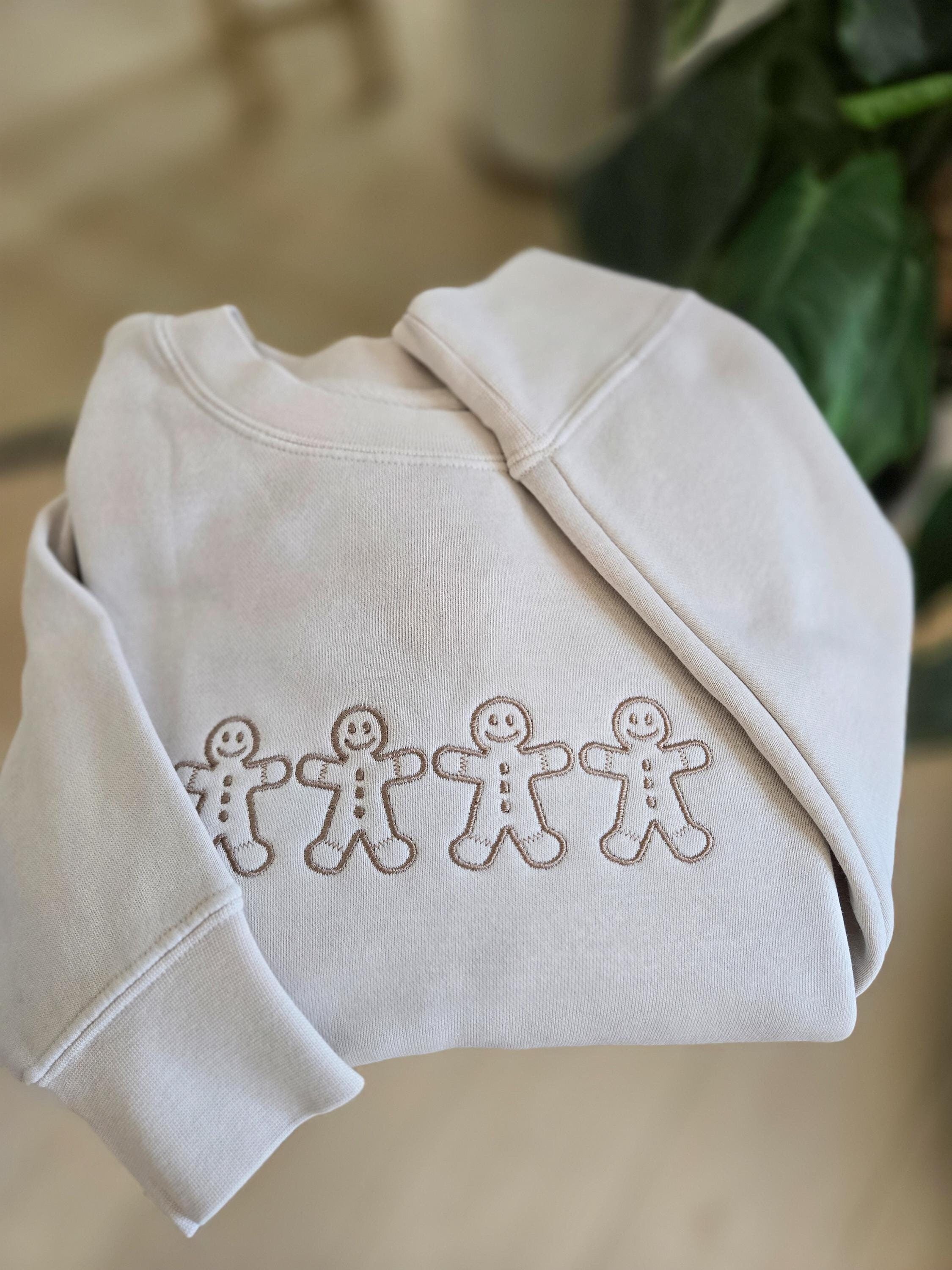 Bundle up in this lineup of adorable gingerbread men sweatshirt. Featuring a lineup of 4 gingerbread men in a brown thread.