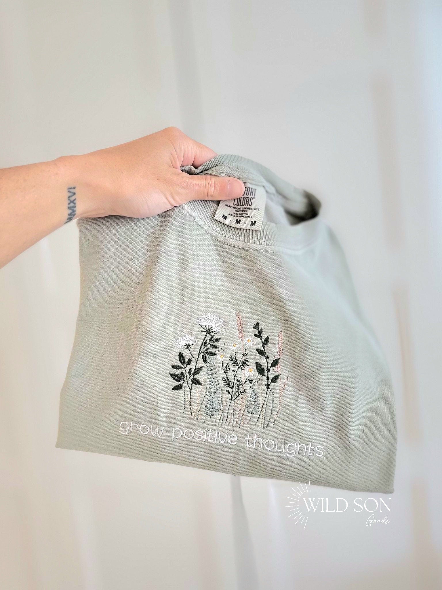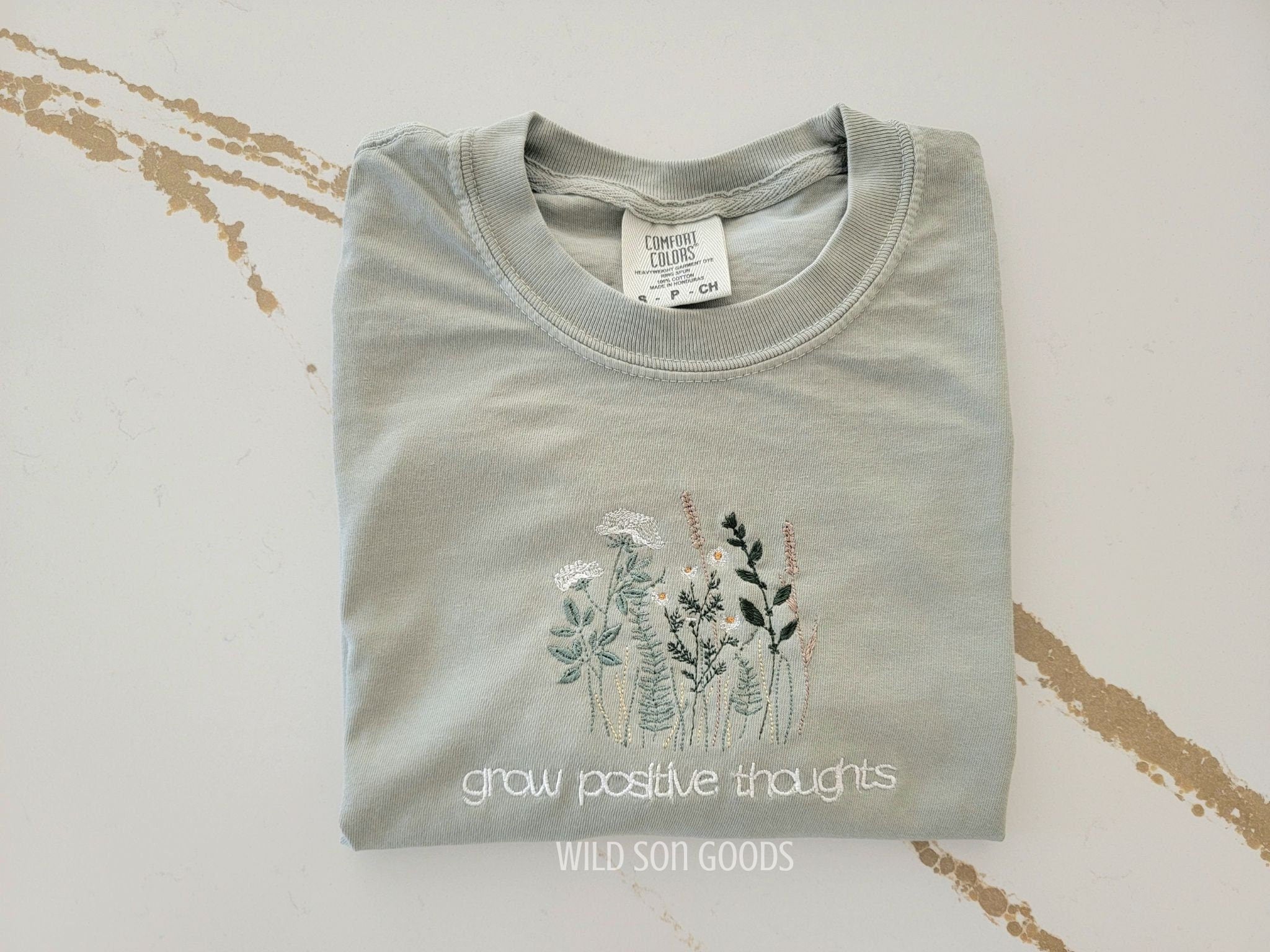 Custom Embroidered Positive affirmations t shirt. Grow Positive thoughts with a beautiful arrangement of muted toned wildflowers above.
