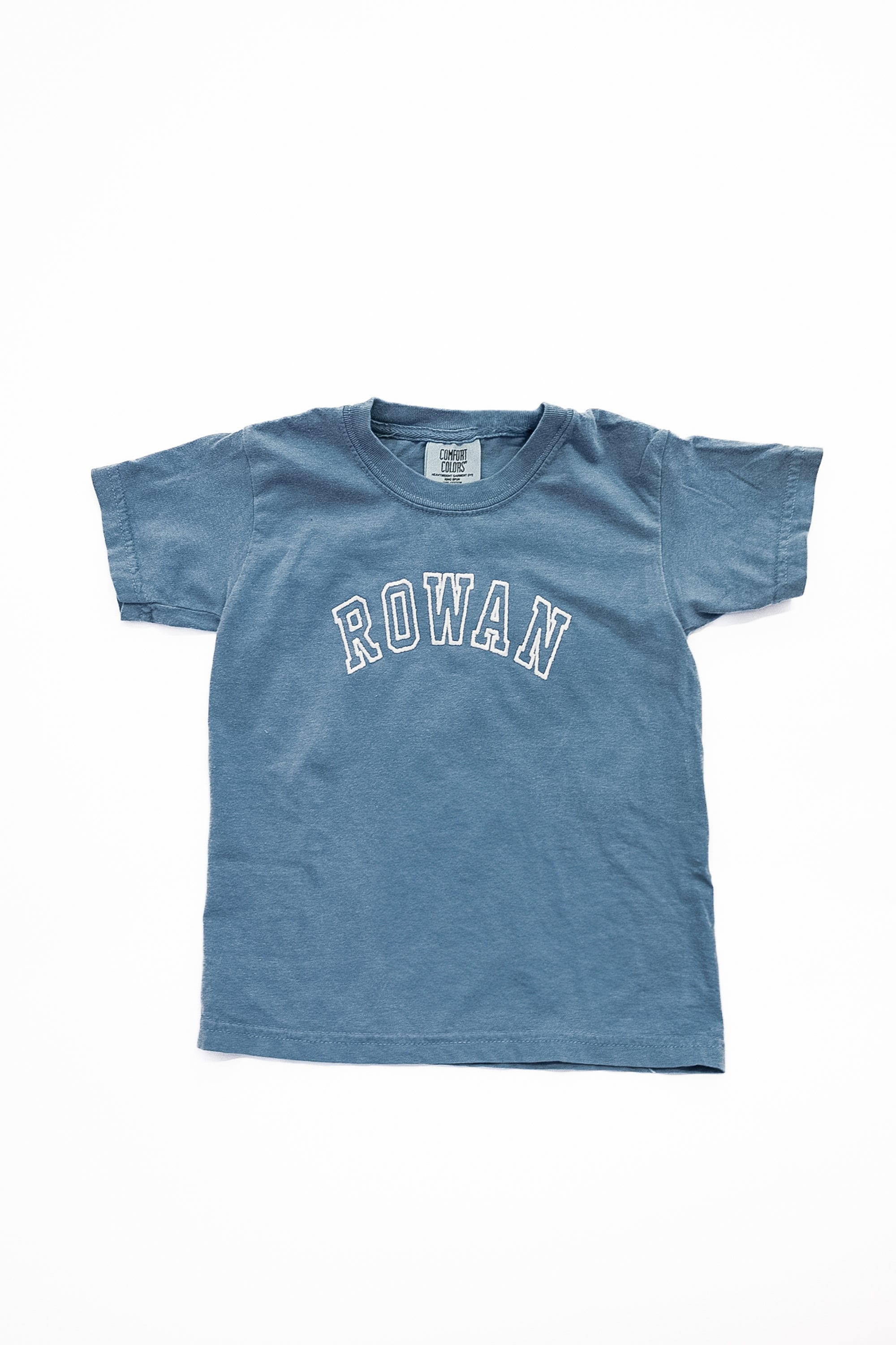 Comfort Color t shirts for kids! Made with a varsity font with a slight curve.