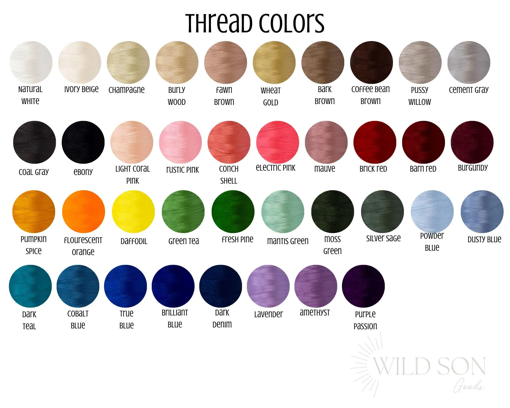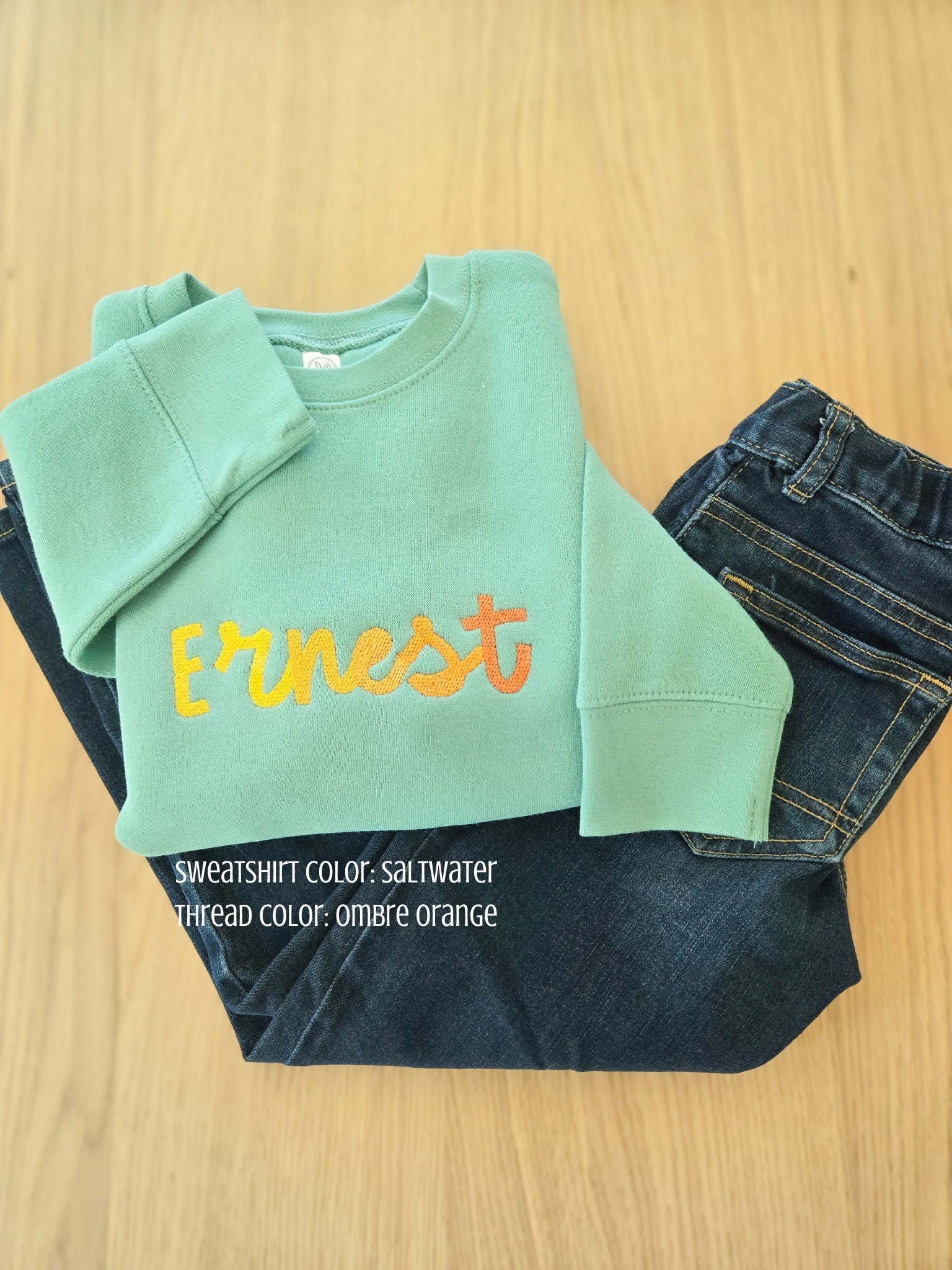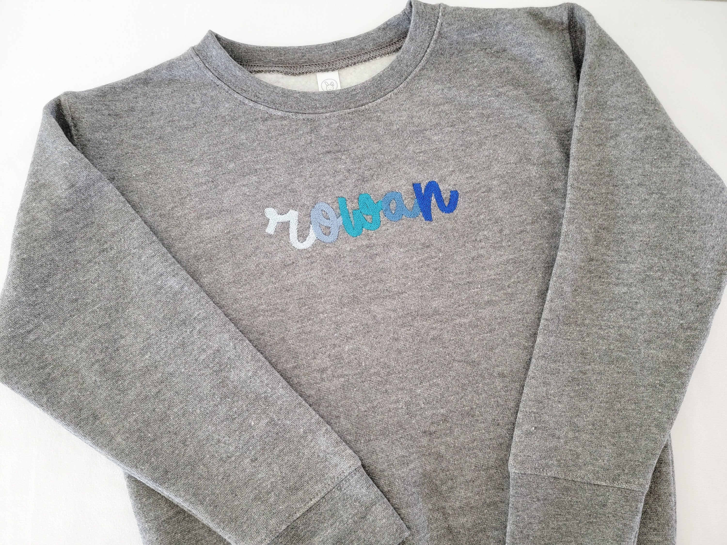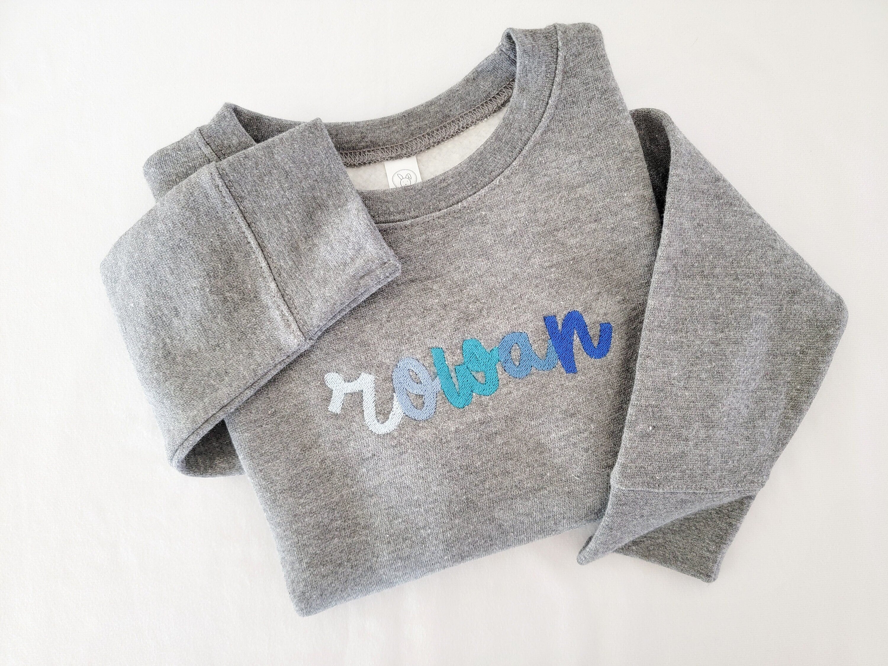Custom embroidered toddler name sweatshirt made with a cursive font. The longer the name the smaller the font will be. Completely customize with different colors for each letter or all one color.