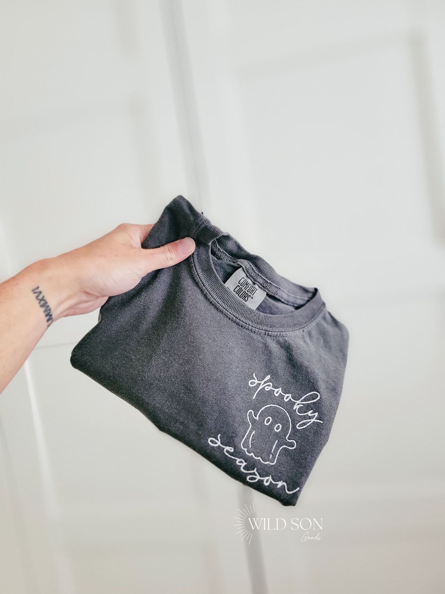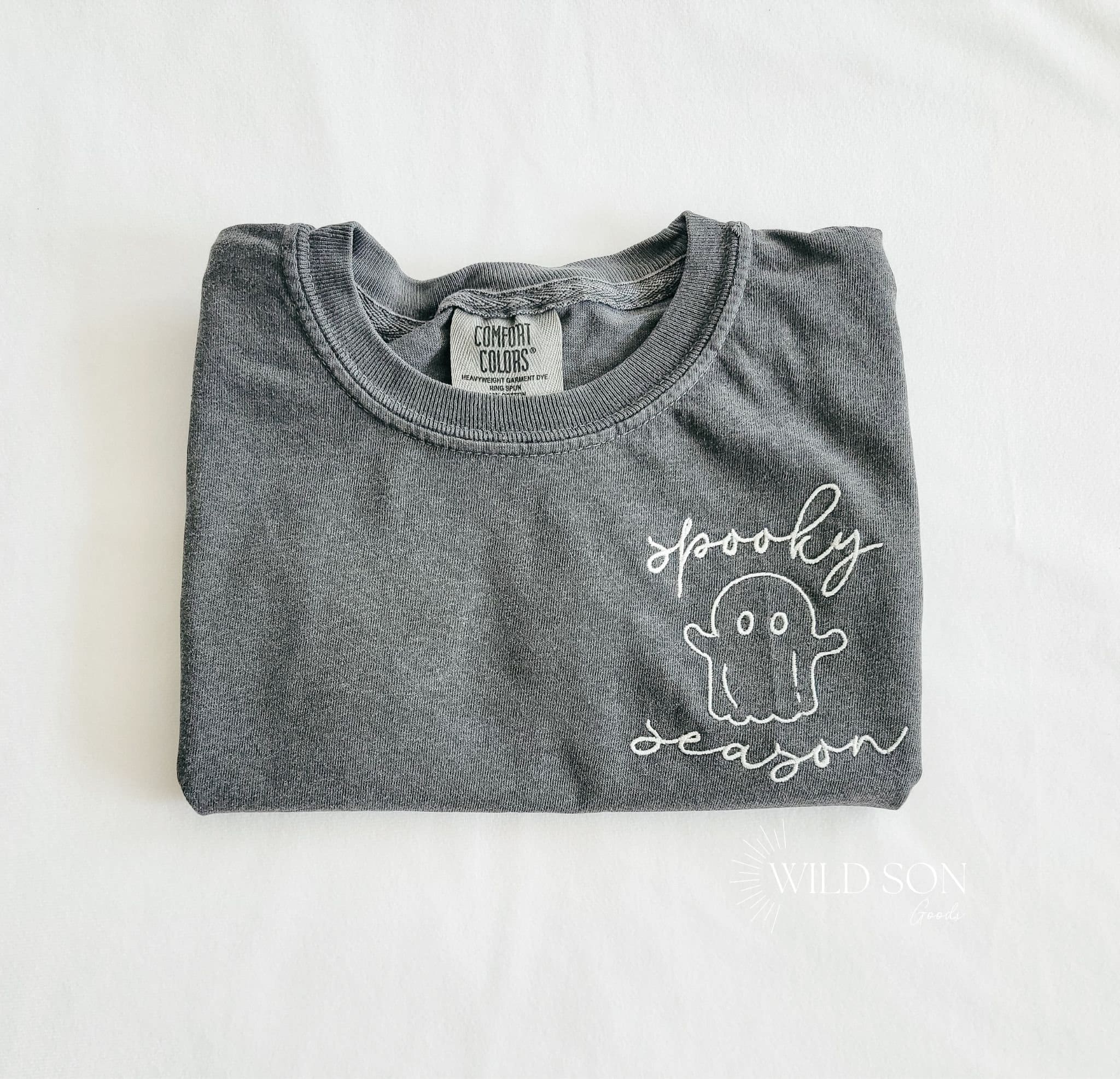 Spooky season ghost Comfort Color t shirts for kids! Sample photo is shown on the pepper colored t shirt which is not yet listed on my color chart but is available to select in the colors drop down.