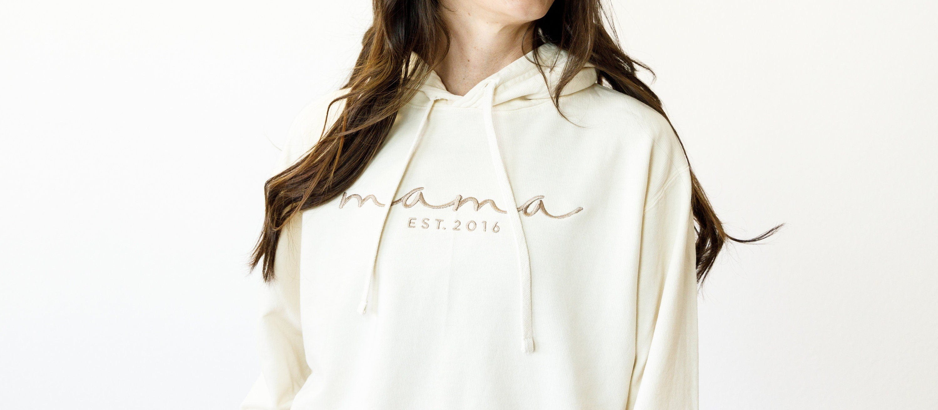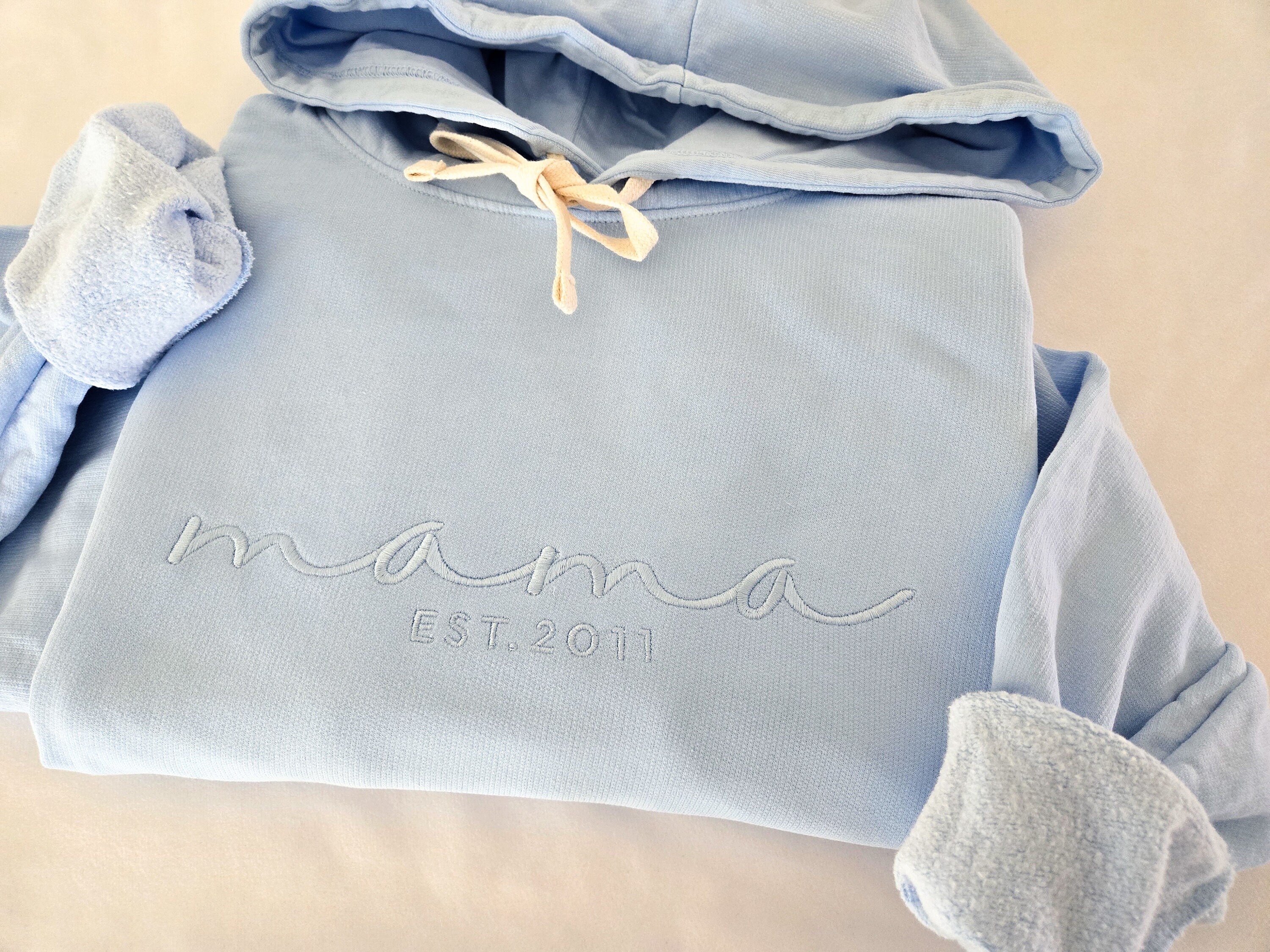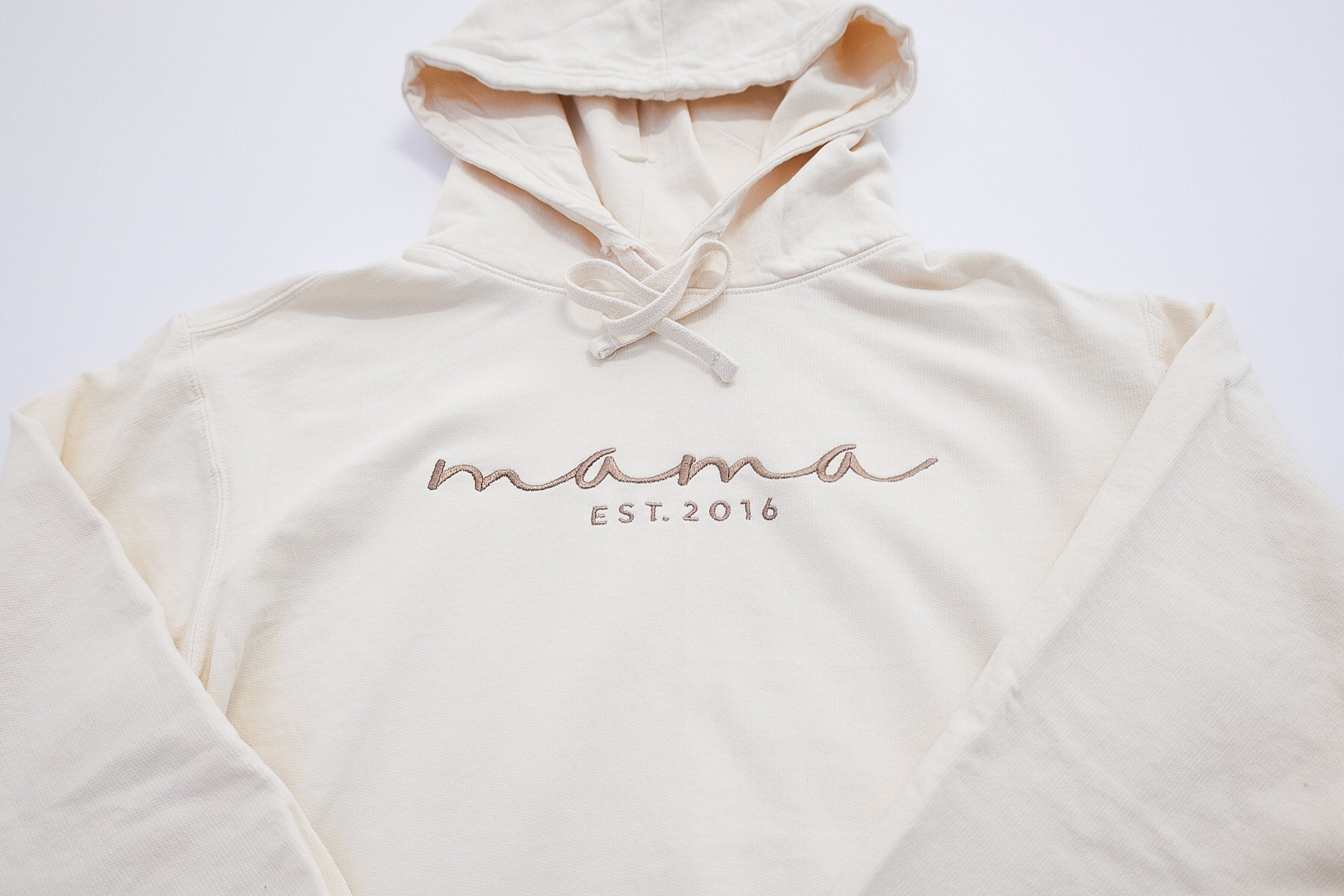 Comfort Colors lightweight hooded sweatshirt made with cursive mama and established date.