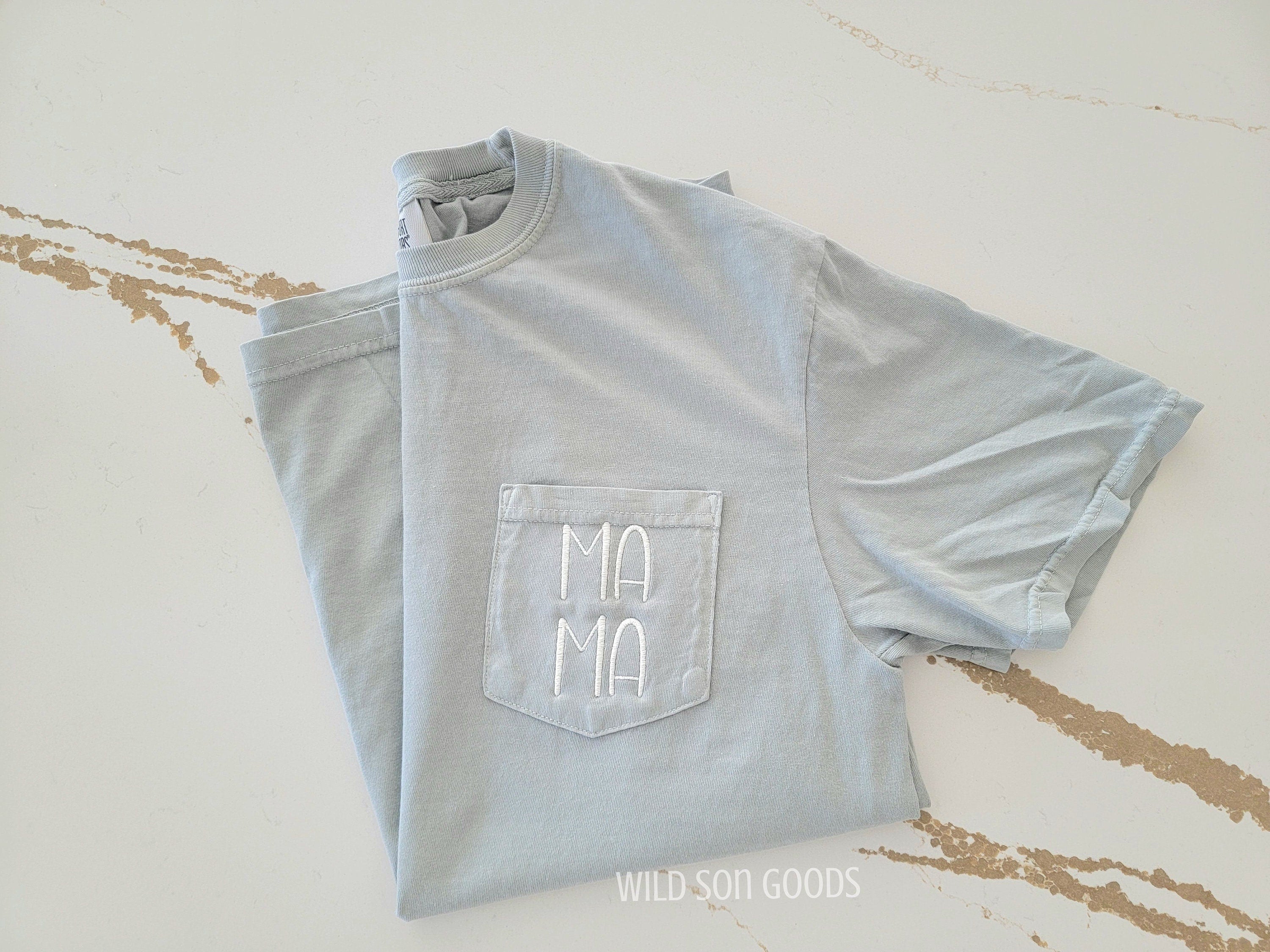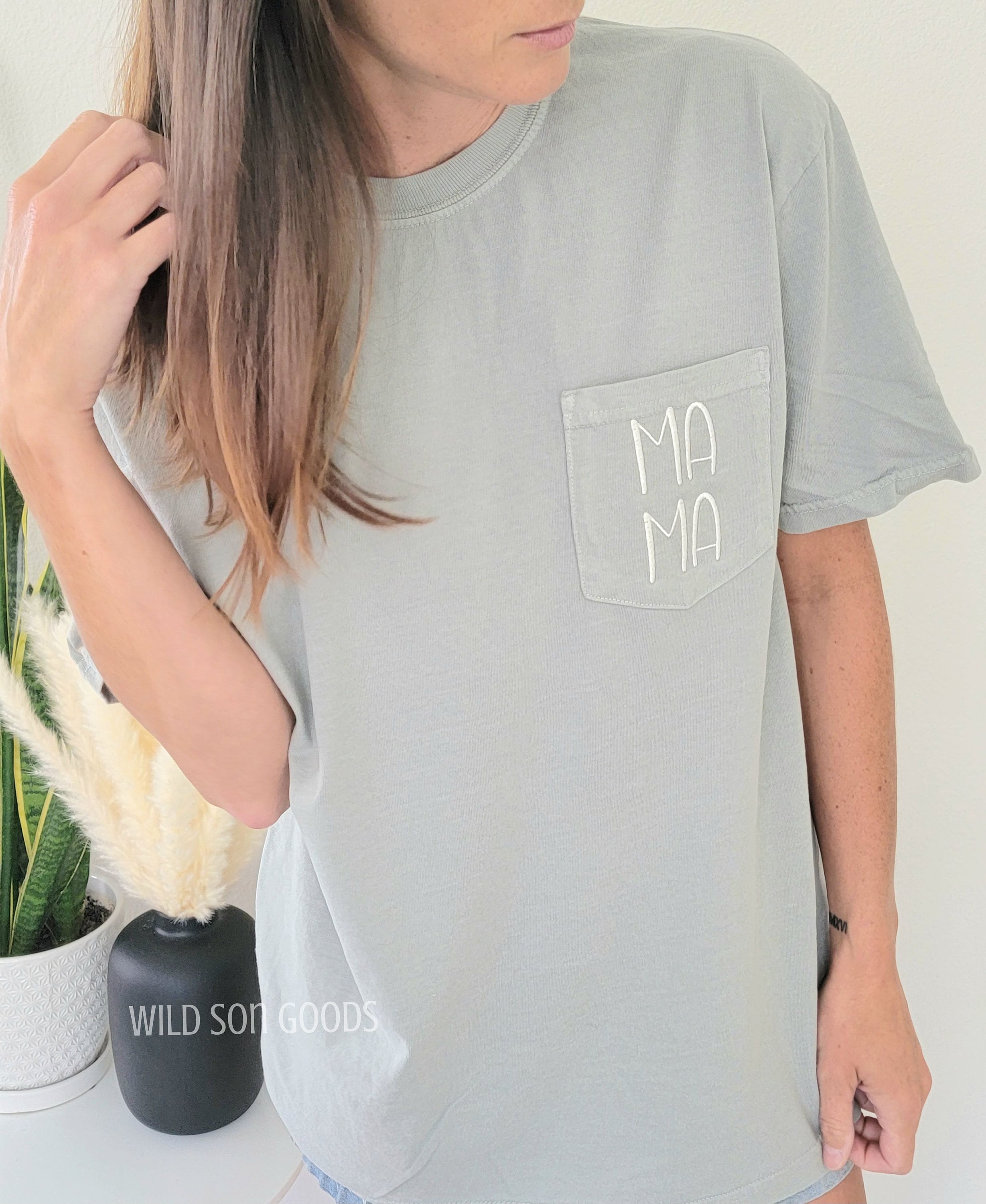 Custom Embroidered mama design on pocket, a few different designs to choose from!