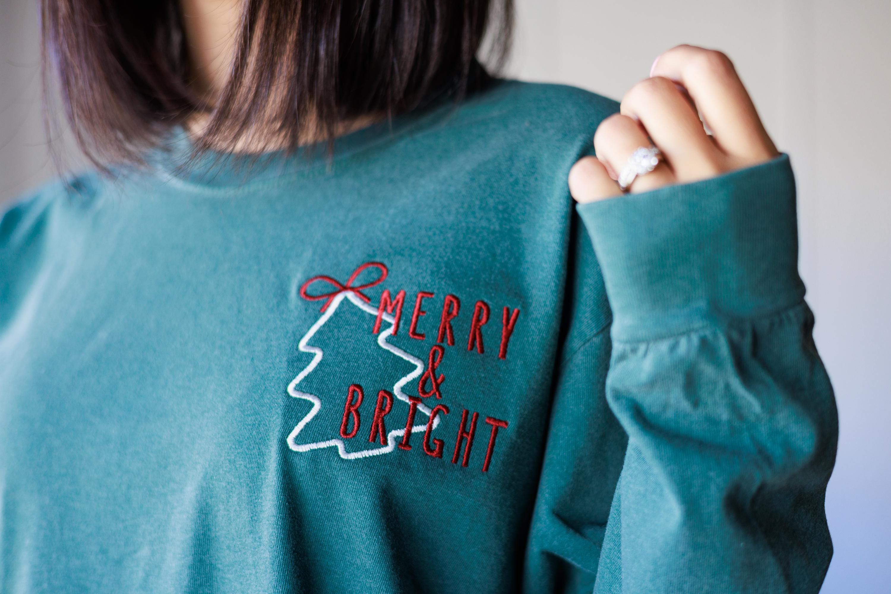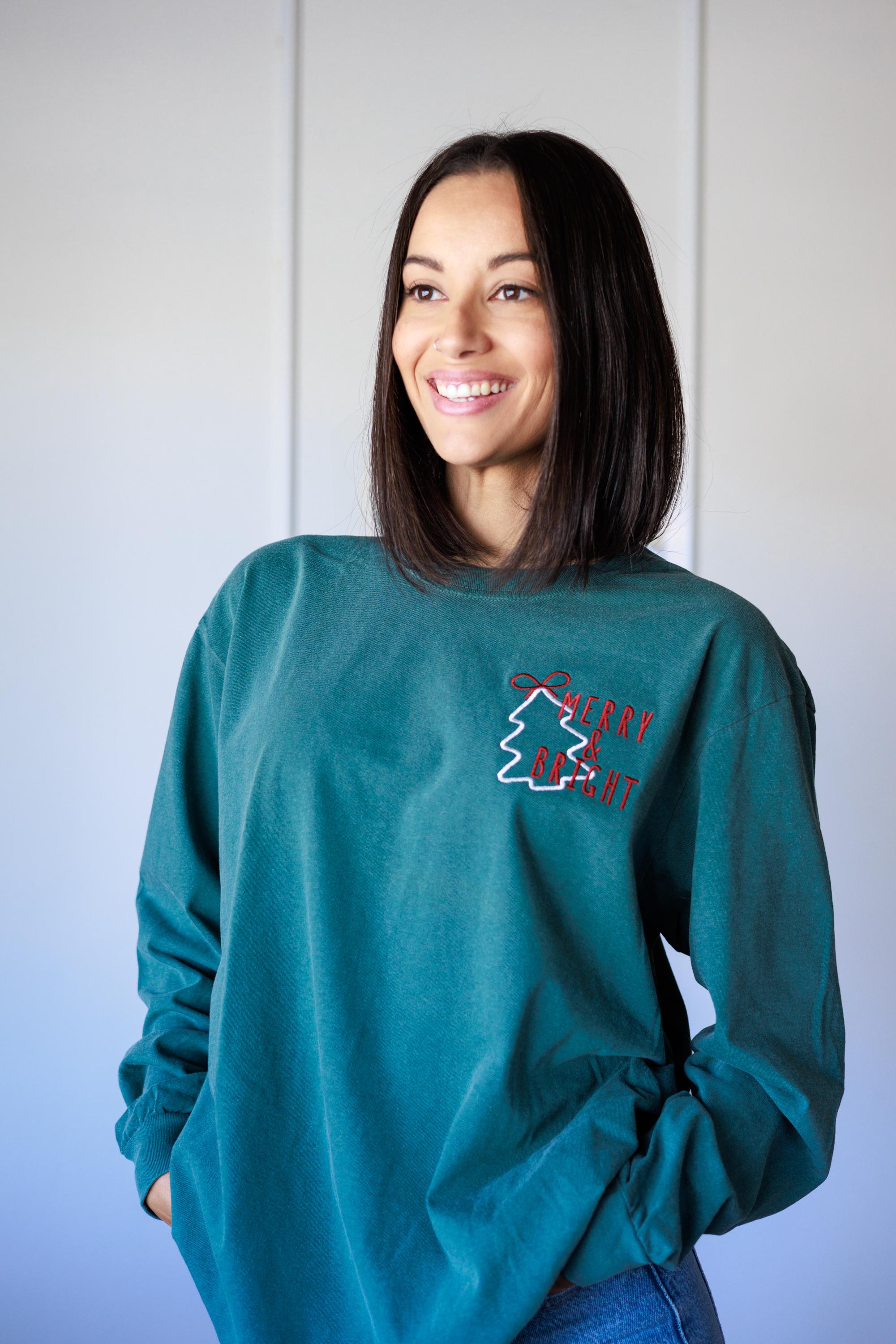 Some warm tones for a beautiful long sleeve shirt. Merry and Bright design on a comfort colors long sleeve, made in a dark red and white. This style has a very modern and simple feel to it and works so perfectly on the blue spruce color shirt.