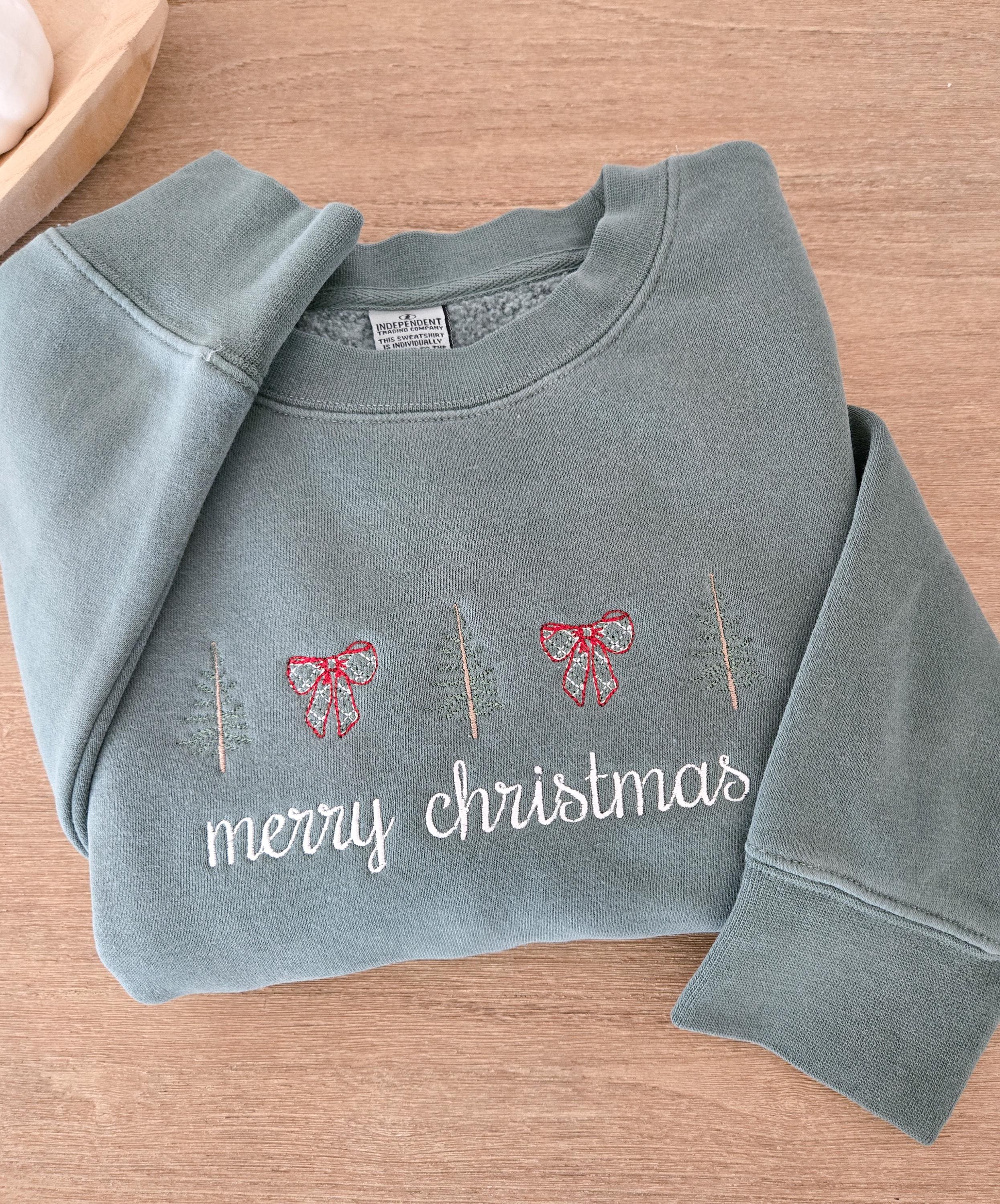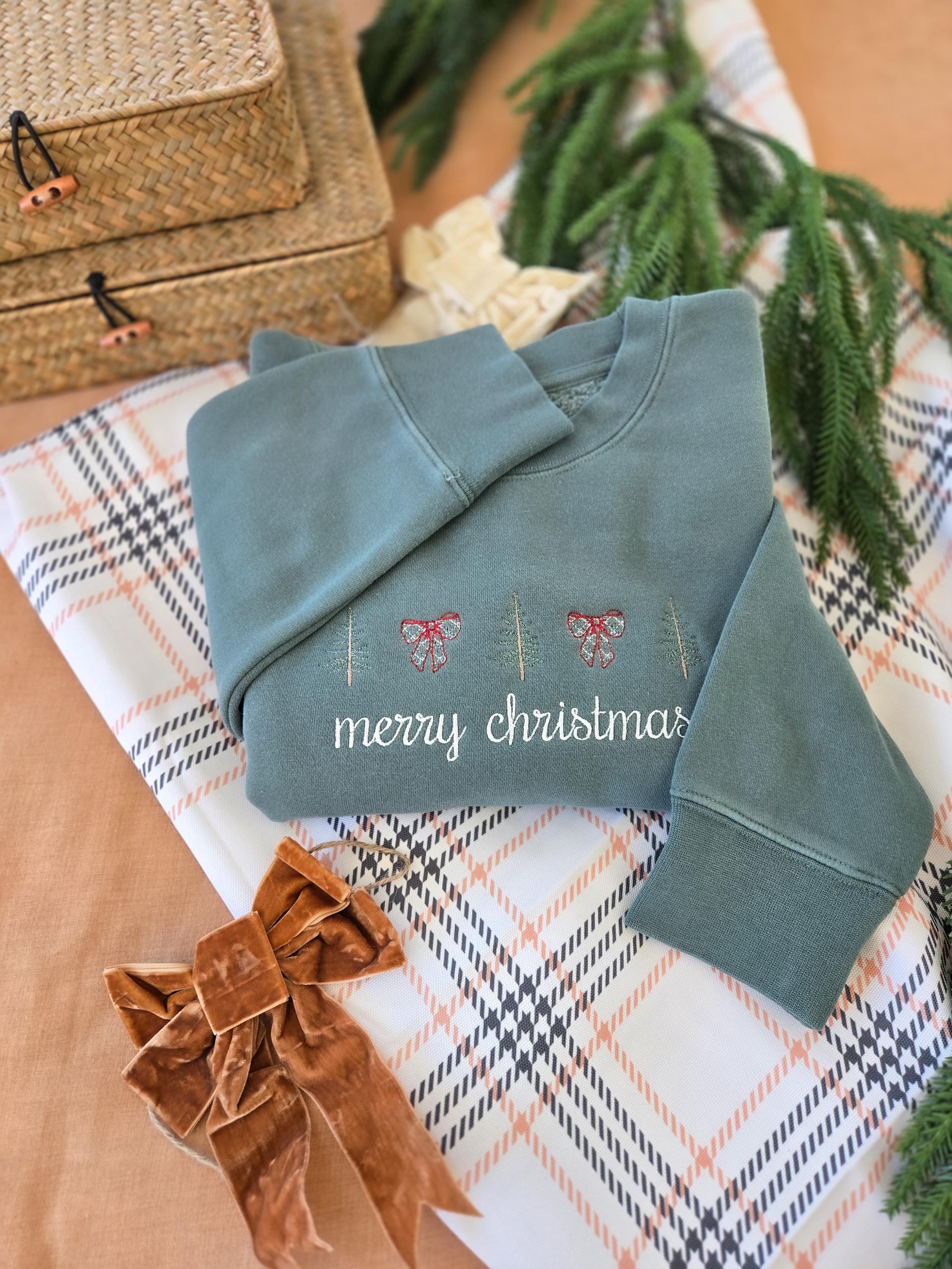How adorable is this Custom Merry Christmas sweatshirt. A good mix of old school with new and trendy. This sweatshirt features embroidered pine trees and plaid bows with a beautiful cursive font saying Merry Christmas. Not only are these sweatshirts oh so cozy, but they give you that warm Christmas feeling.