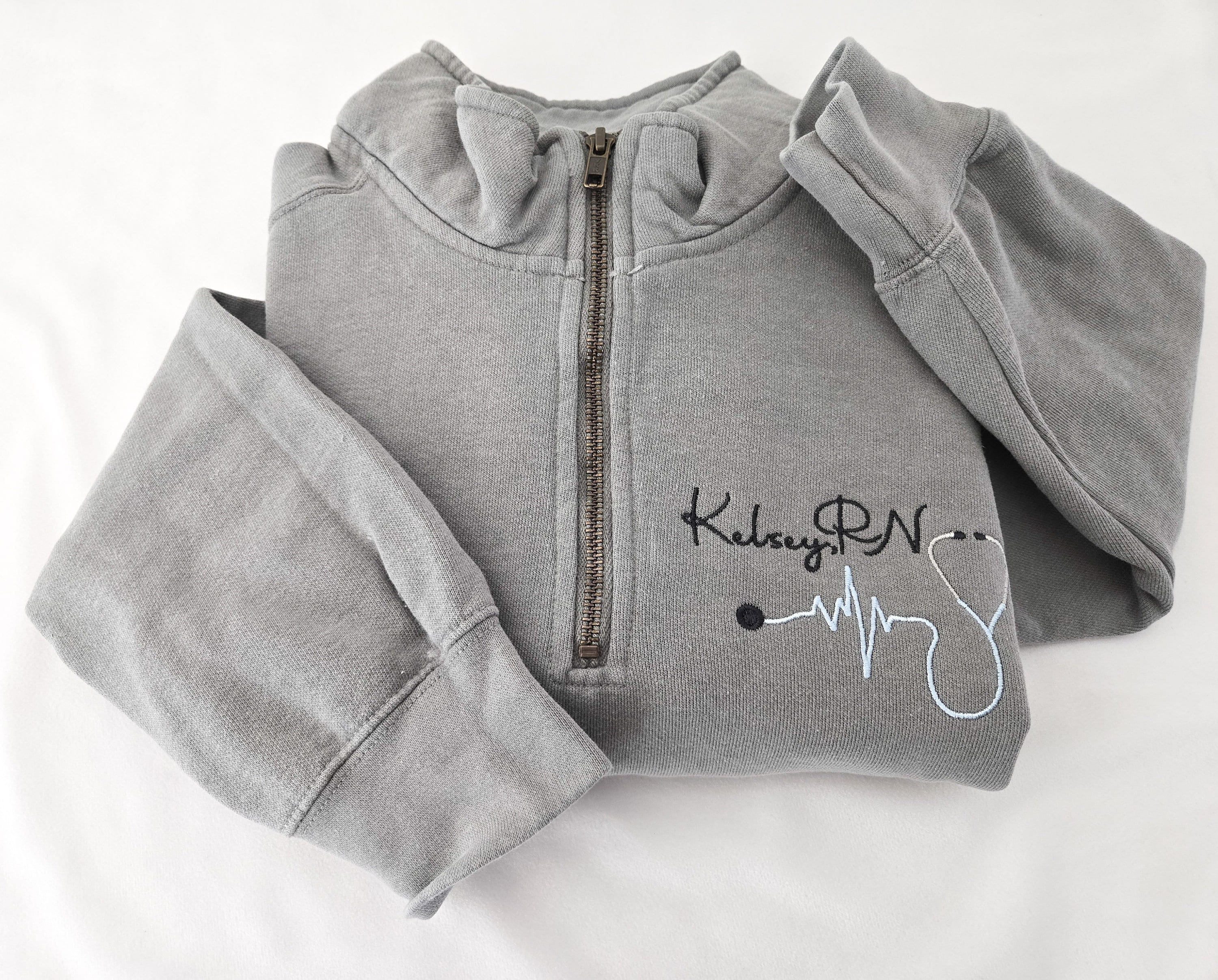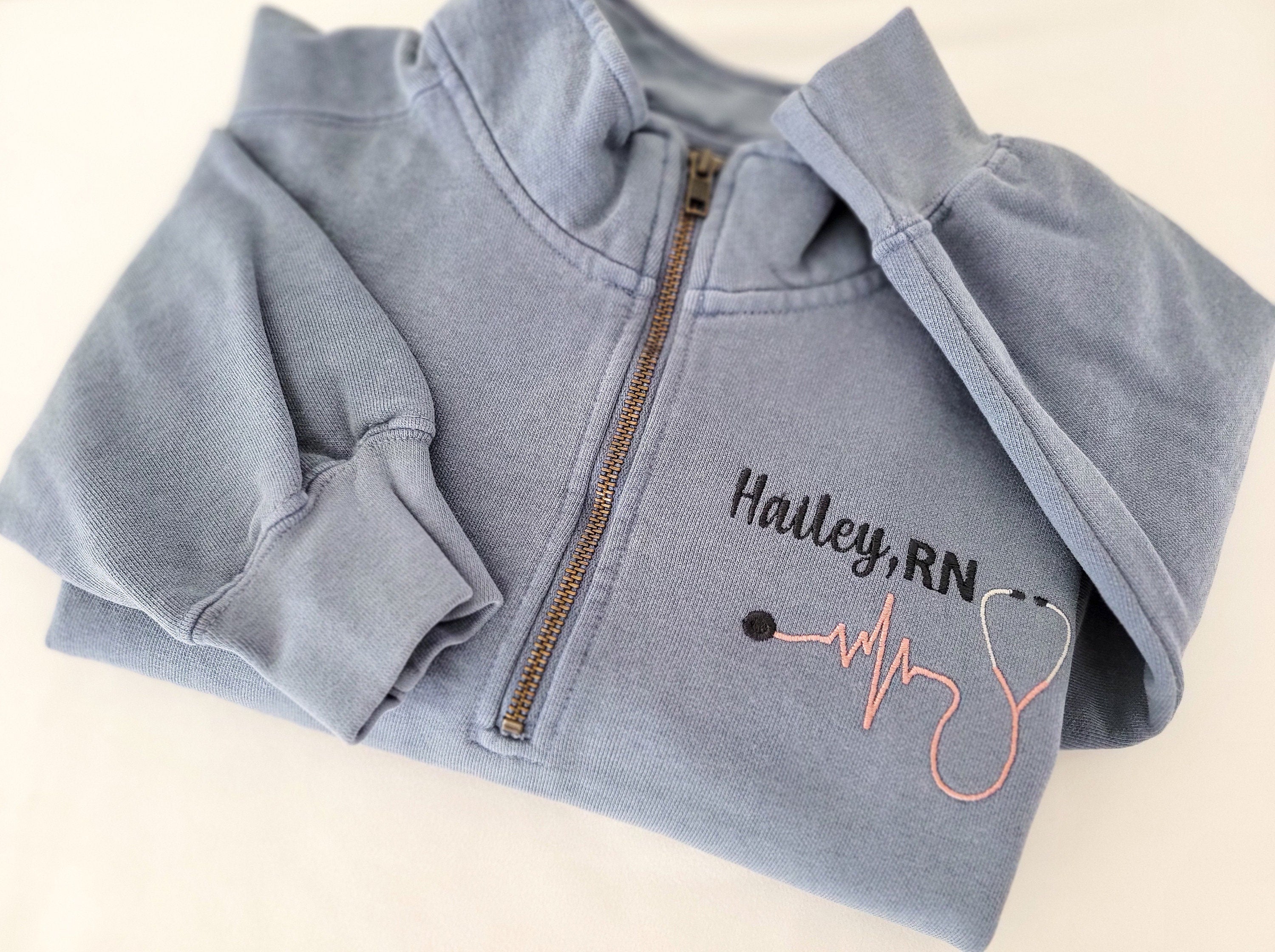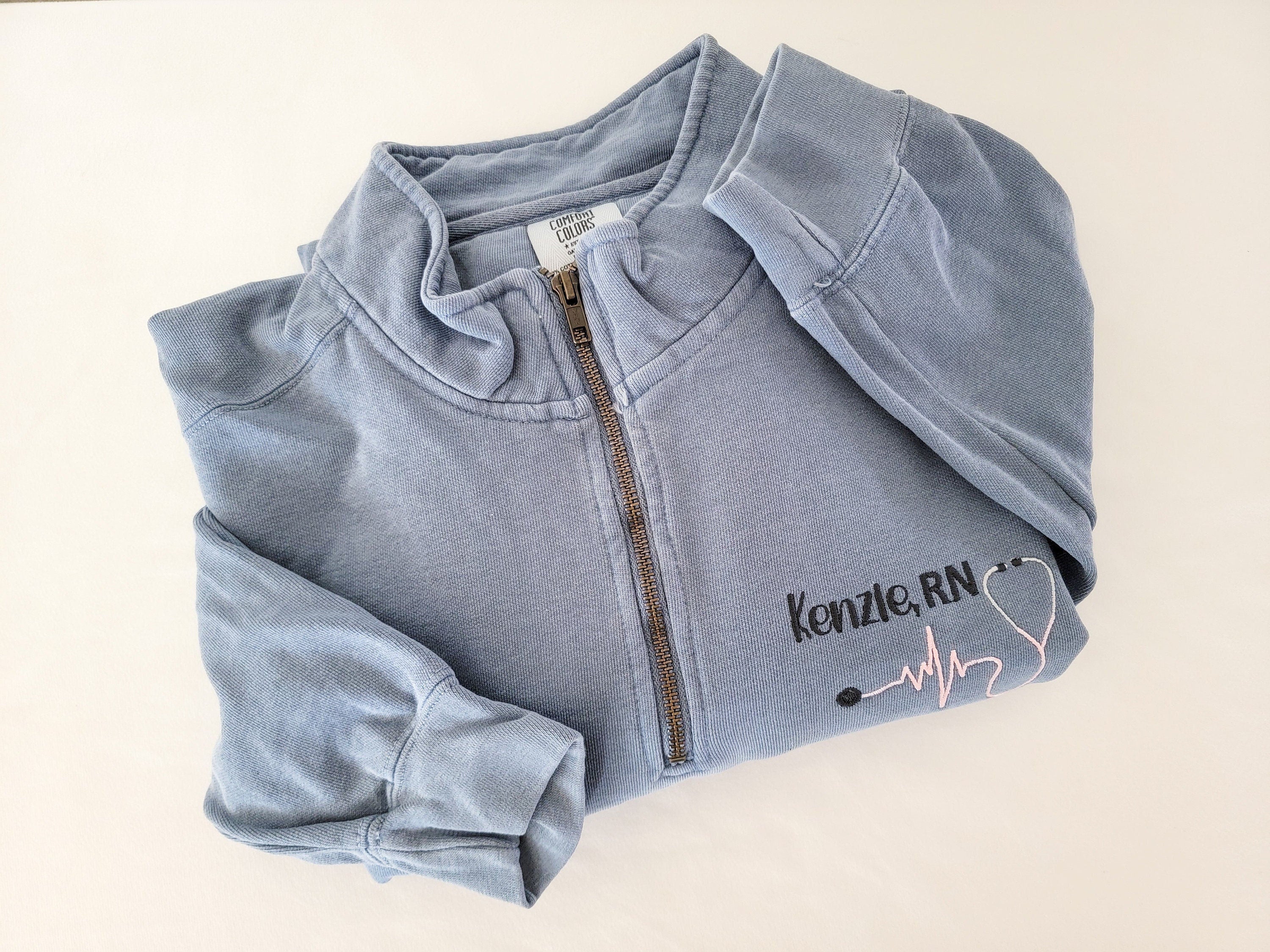 Custom Nurse embroidered quarter zip comfort colors sweatshirts. Fully customize with different fonts.