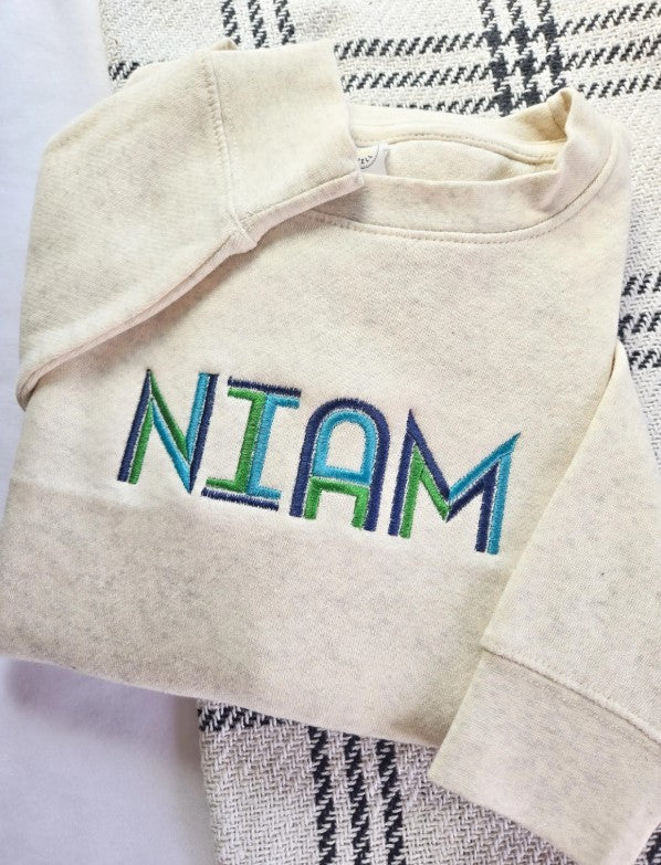 These custom sweatshirts, designed for toddlers, feature a bold, multi-colored retro font, creating a vibrant and playful look. Personalize the sweatshirt with your child's name, making it a one-of-a-kind piece. The striking font and customizable color options offer a fun, nostalgic touch, perfect for adding personality to your little one's wardrobe. Ideal for toddlers who love to stand out, these sweatshirts combine comfort, style, and a bit of retro flair.