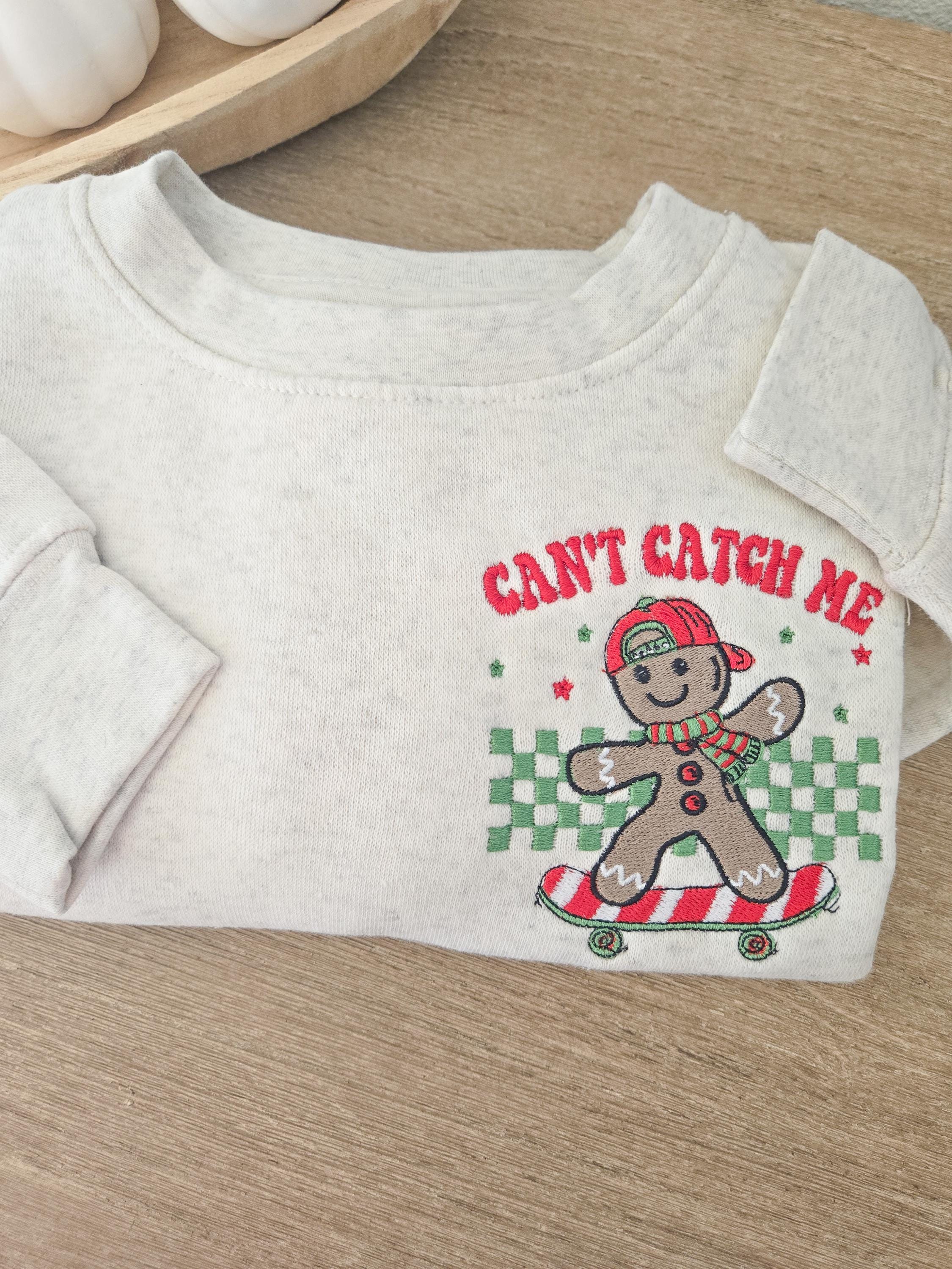 How cute is this mix of Christmasy and sporty? Not only are these sweatshirts super soft and cozy, but they feature a skateboarding gingerbread man saying can't catch me! Such a fun design for your littles to wear and even match for the holidays!