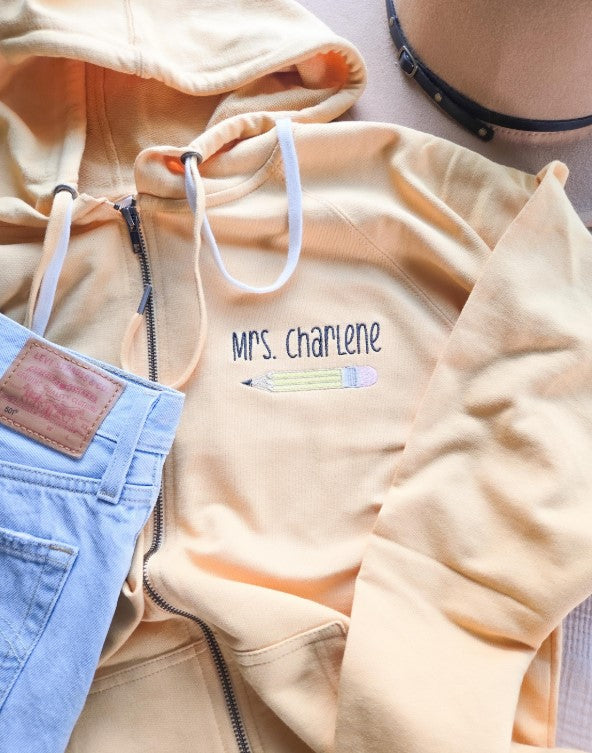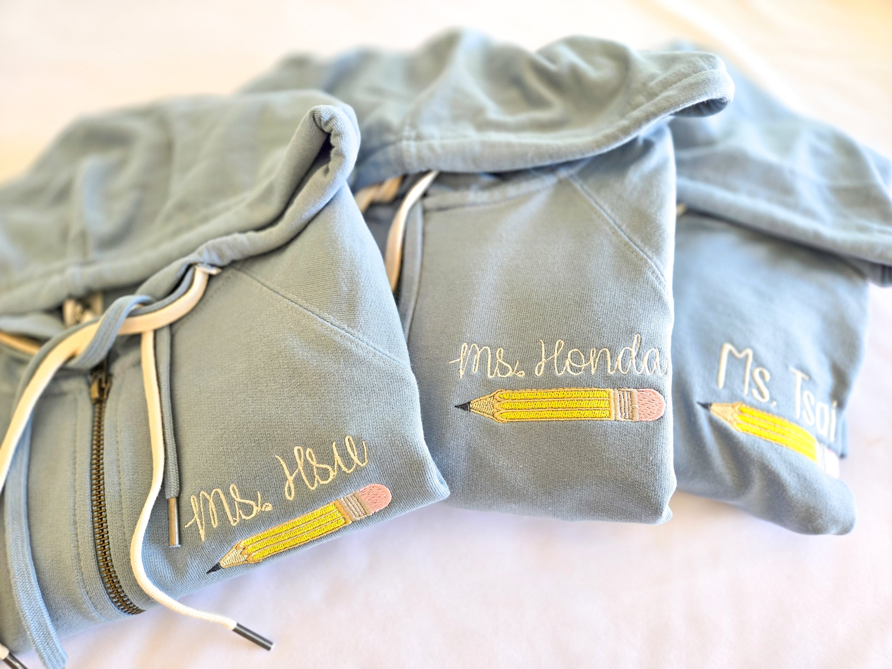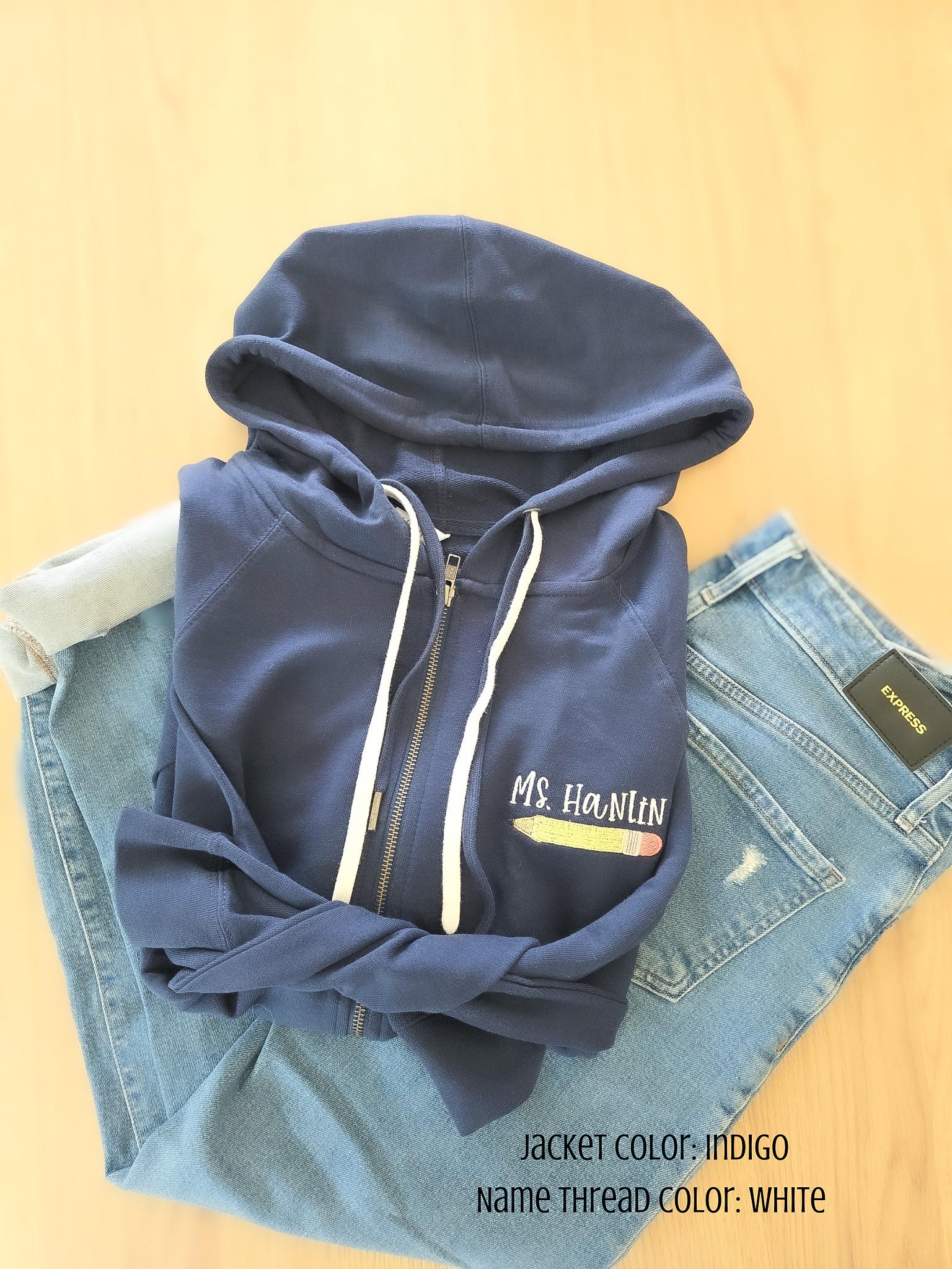 Custom embroidered teacher jacket. Made with pencil design underneath.