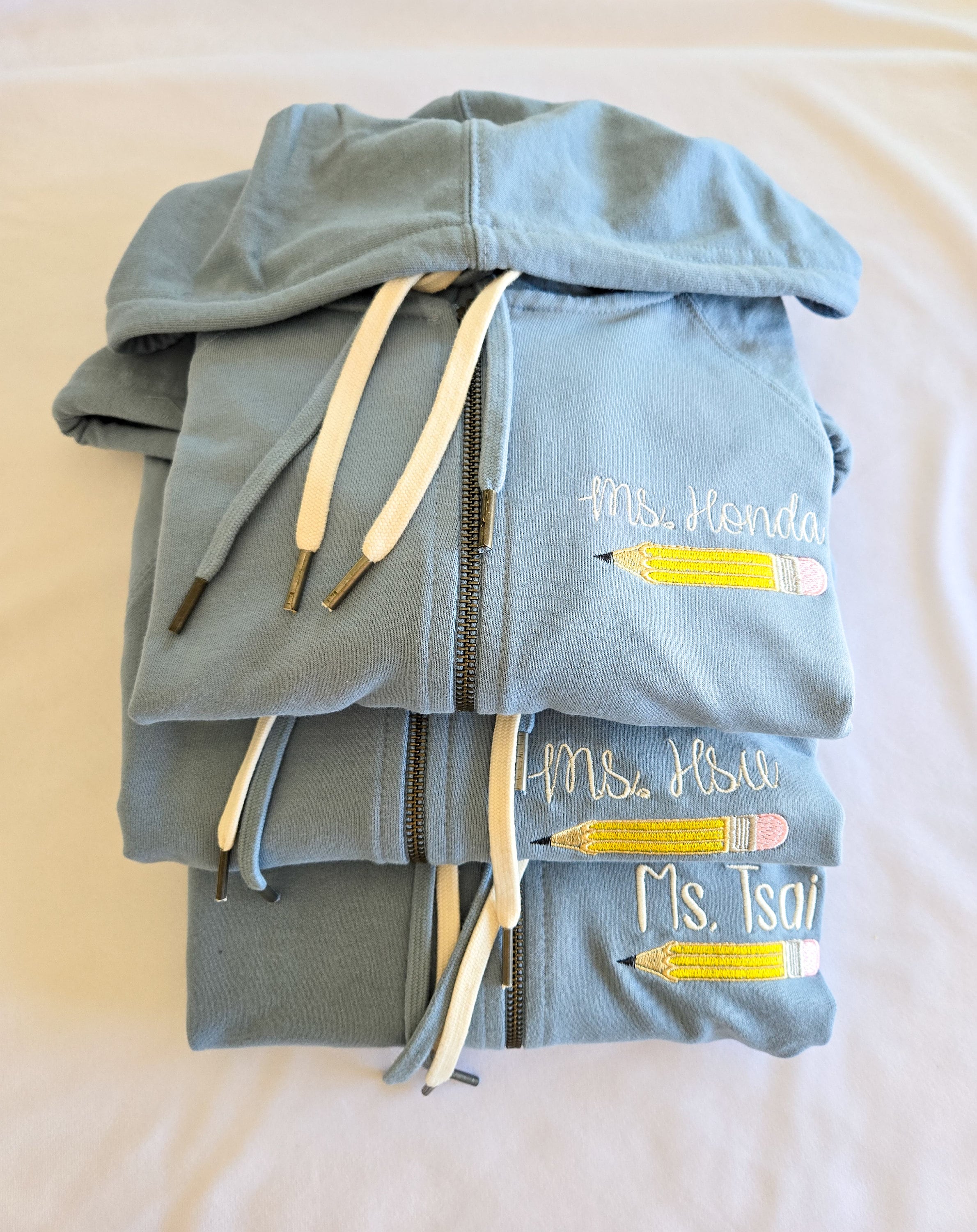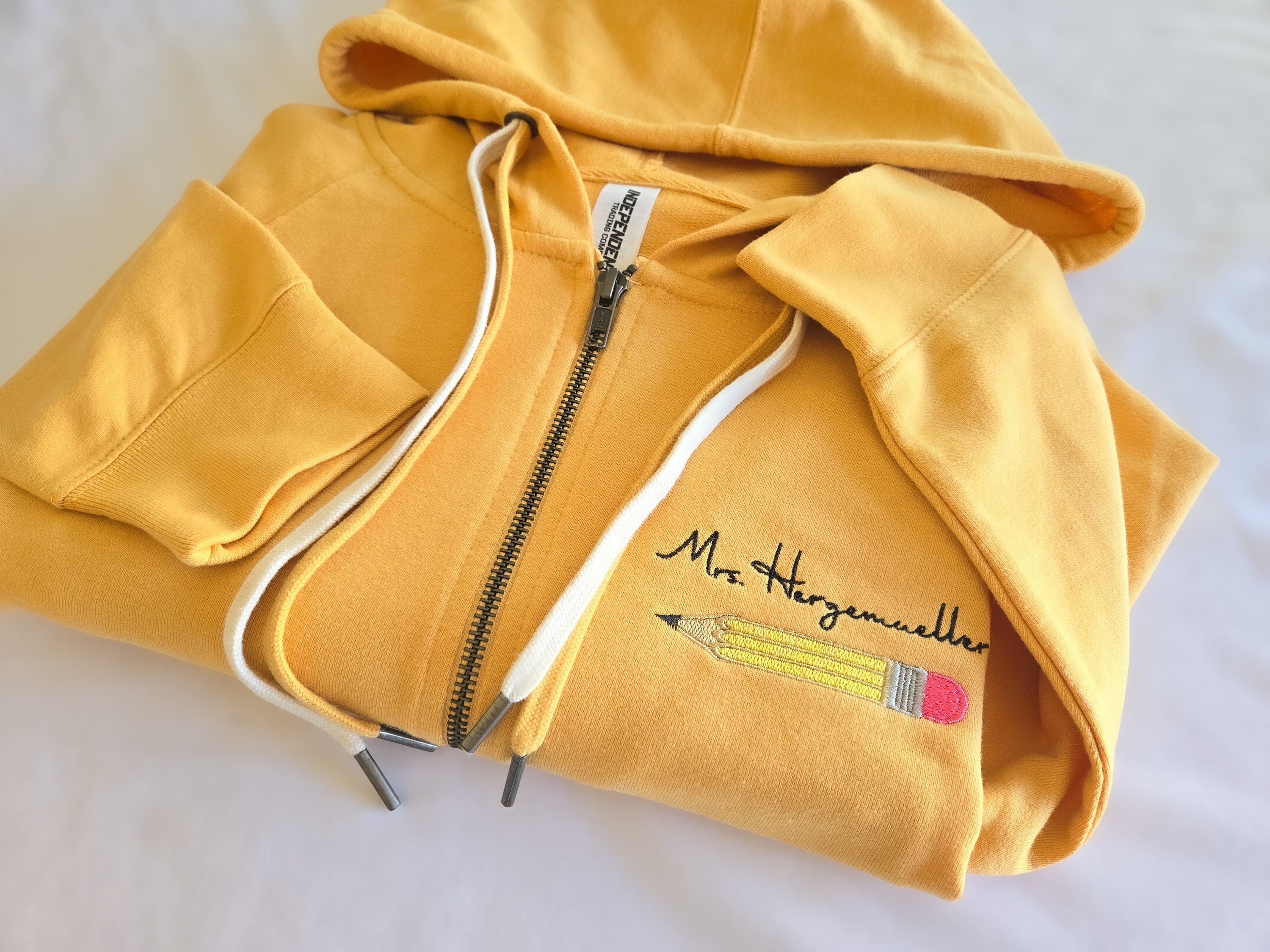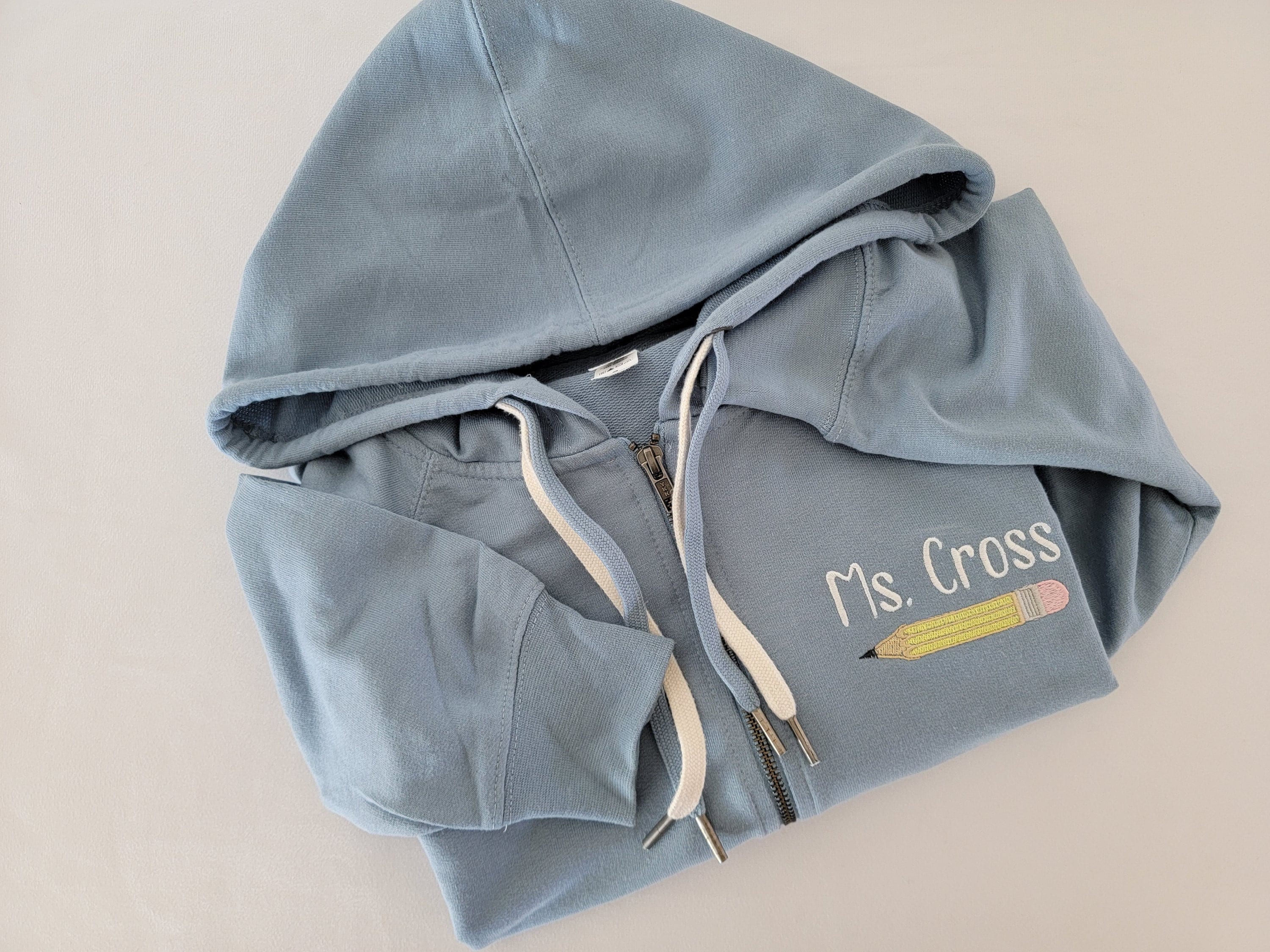 Custom embroidered teacher jacket. Made with pencil design underneath.