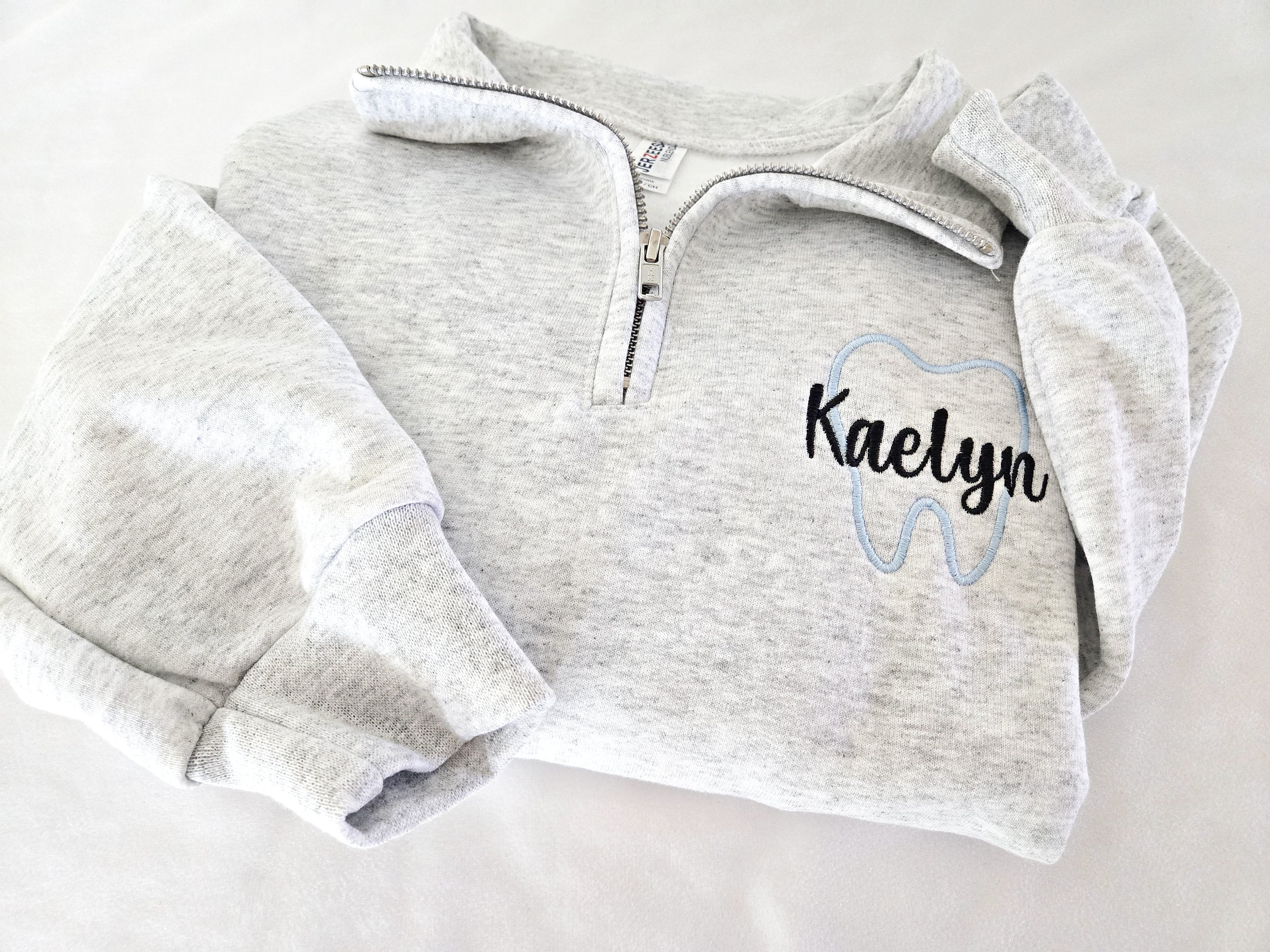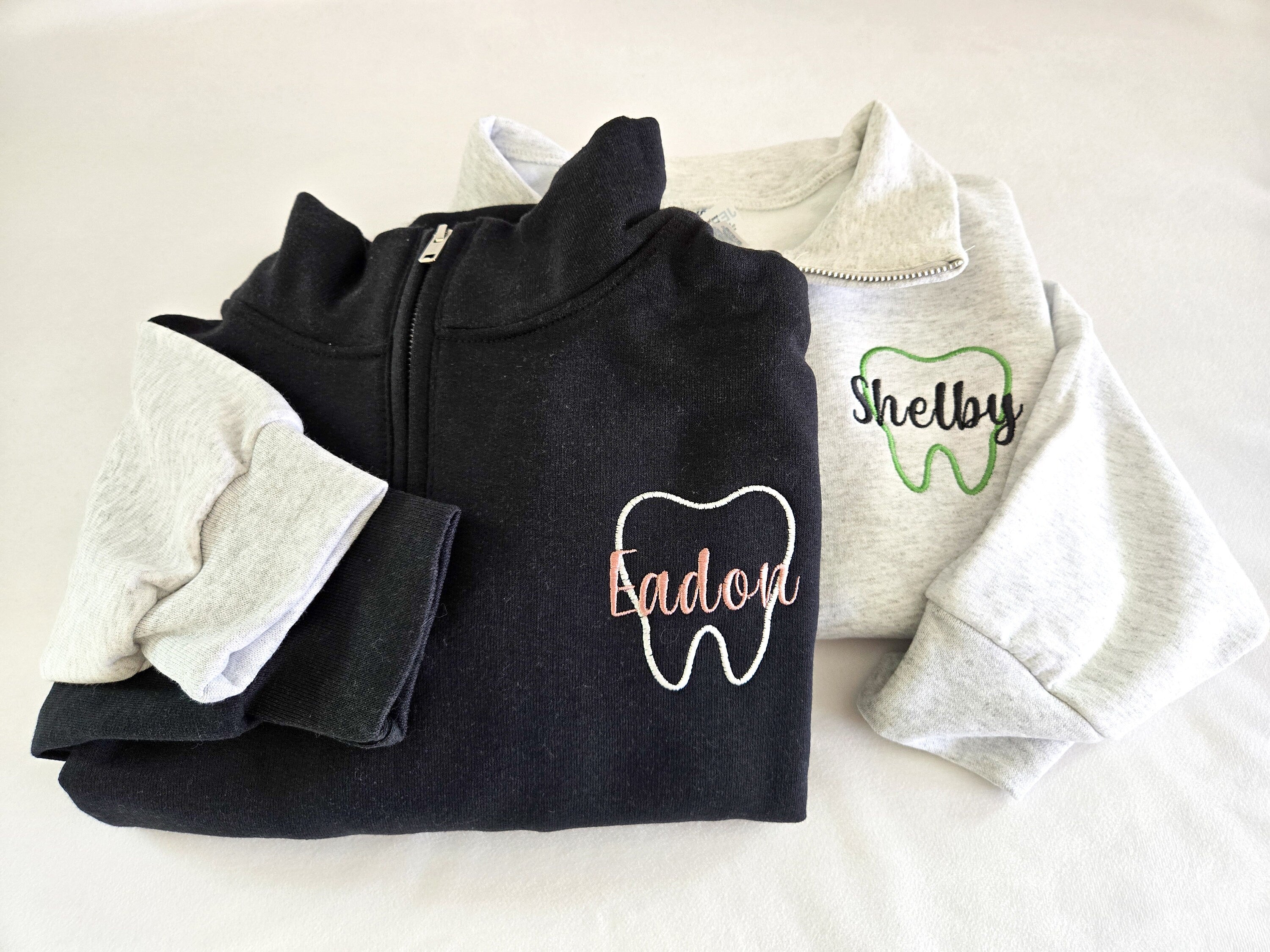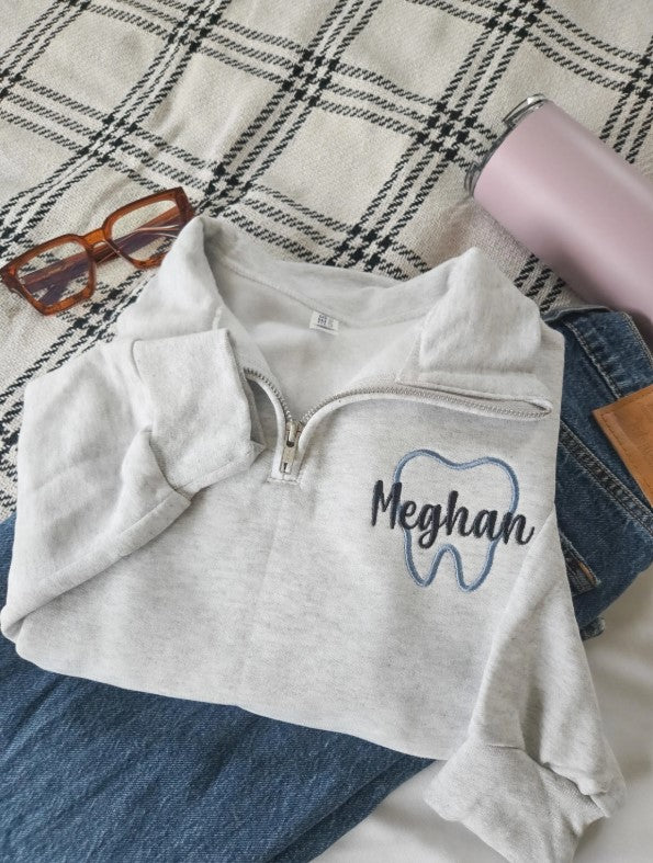 Use these for your Dental office wear! Custom Dental sweatshirt quarter zip. Made with a tooth outline and your name across! Choose from many different thread colors!