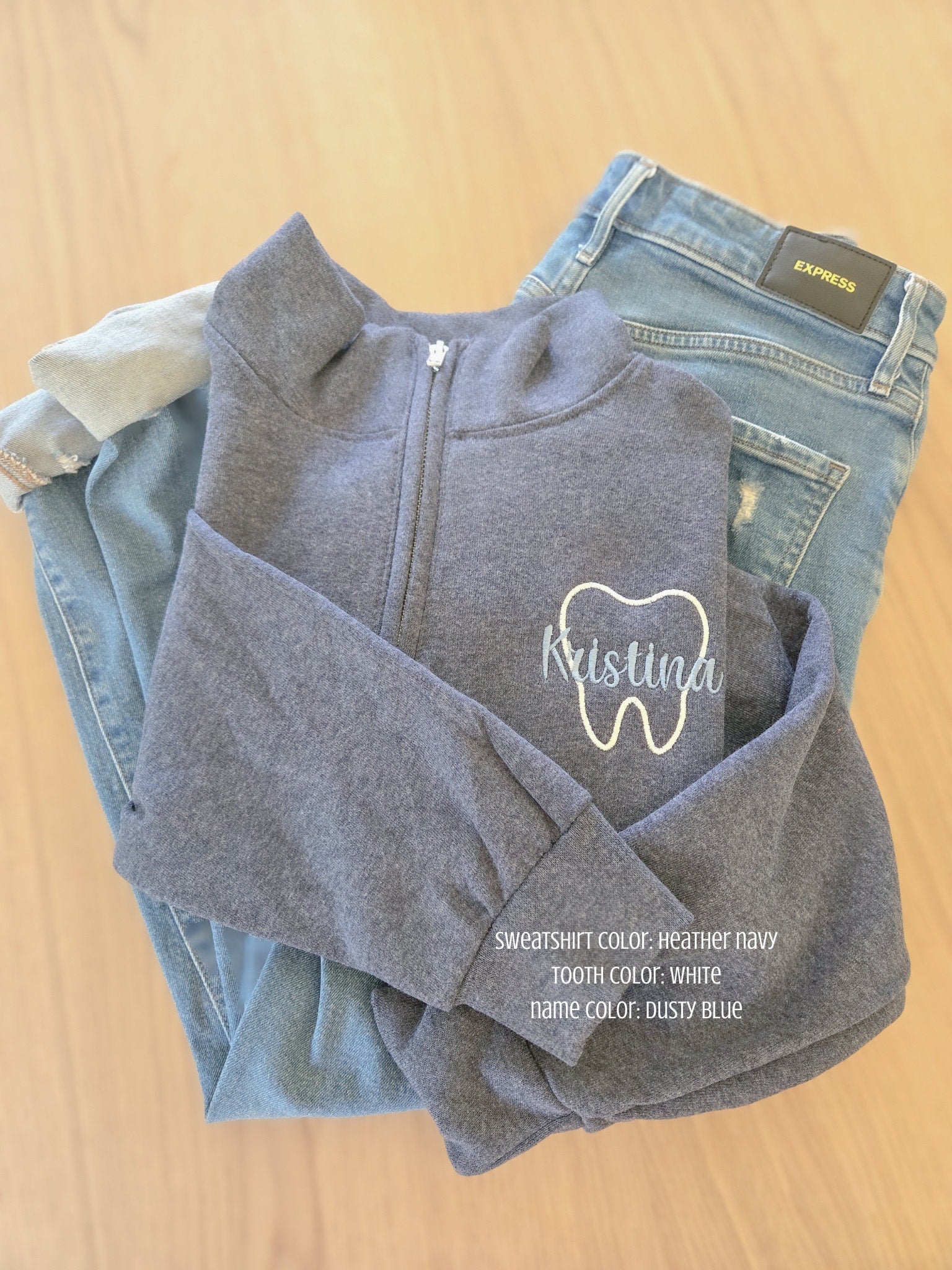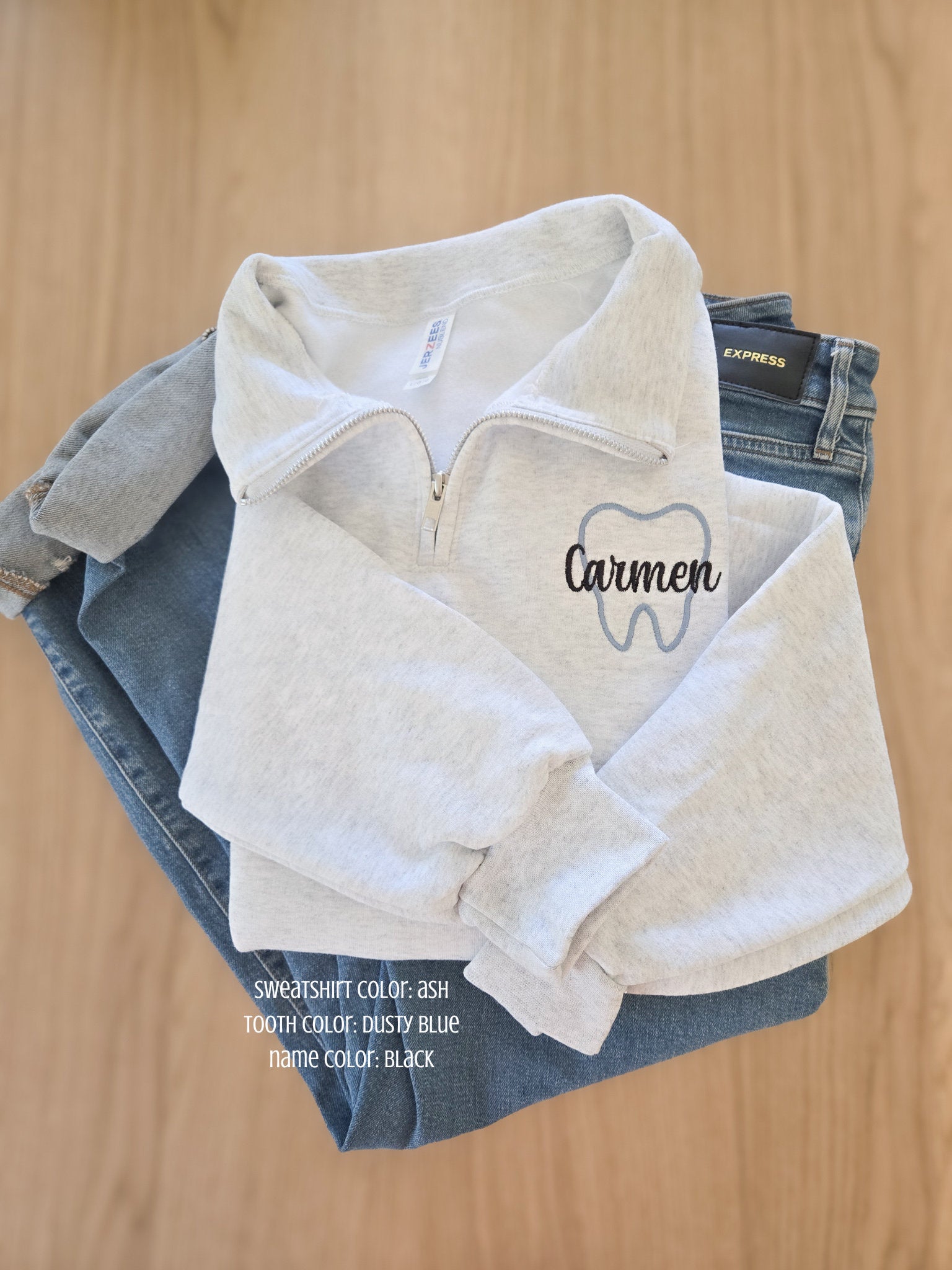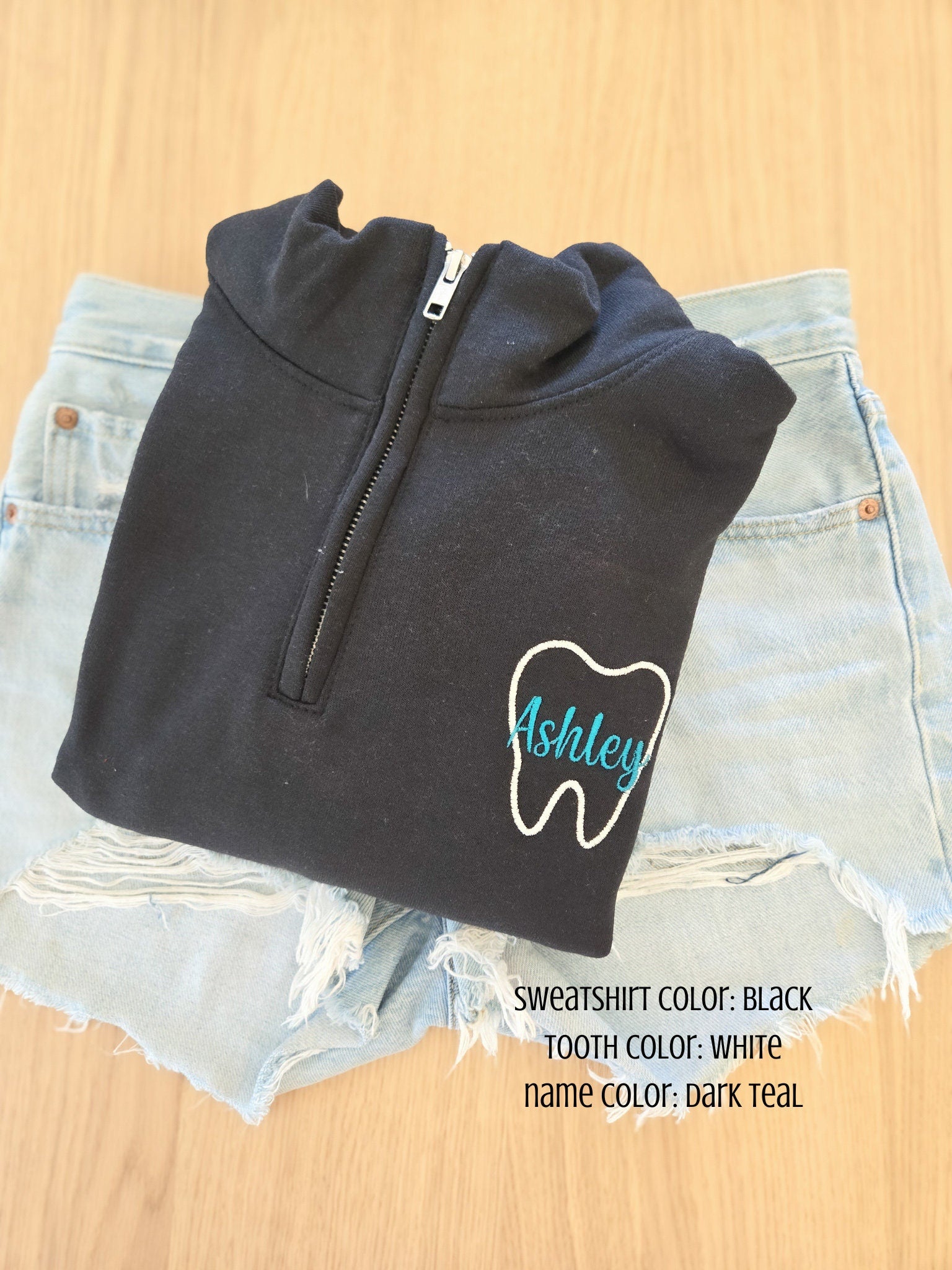 Use these for your Dental office wear! Custom Dental sweatshirt quarter zip. Made with a tooth outline and your name across! Choose from many different thread colors!