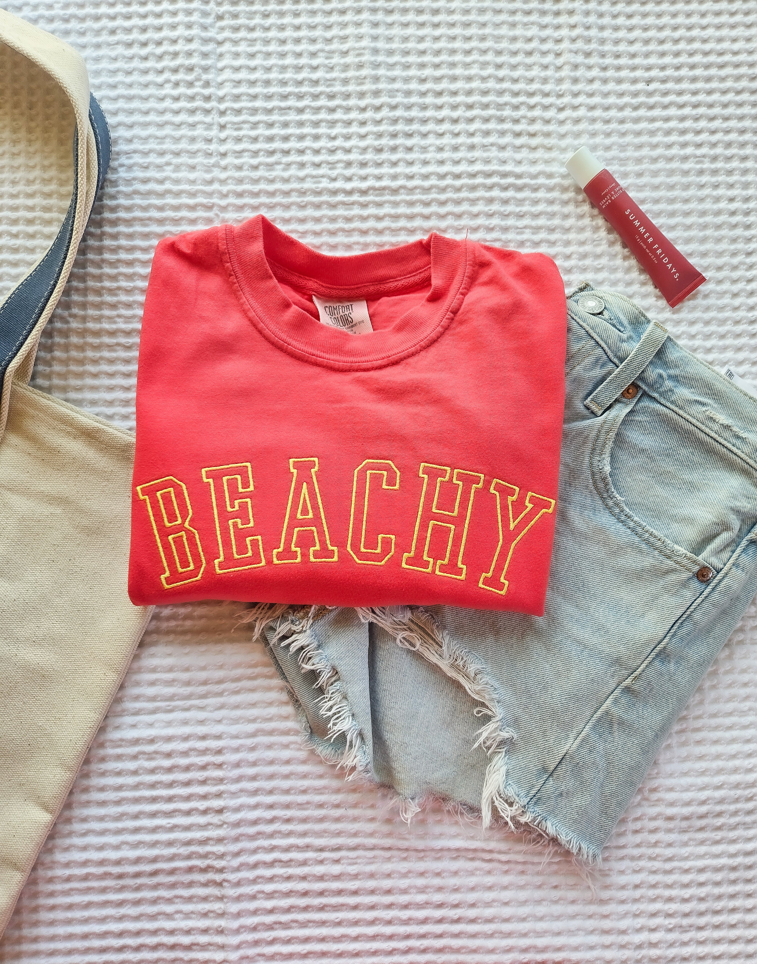 This varsity-style Beachy embroidered tee is stitched on a soft, garment-dyed Comfort Colors shirt—perfect for laid-back summer days. A fun and bold design that’s a must-have for beach lovers and sunny adventures!