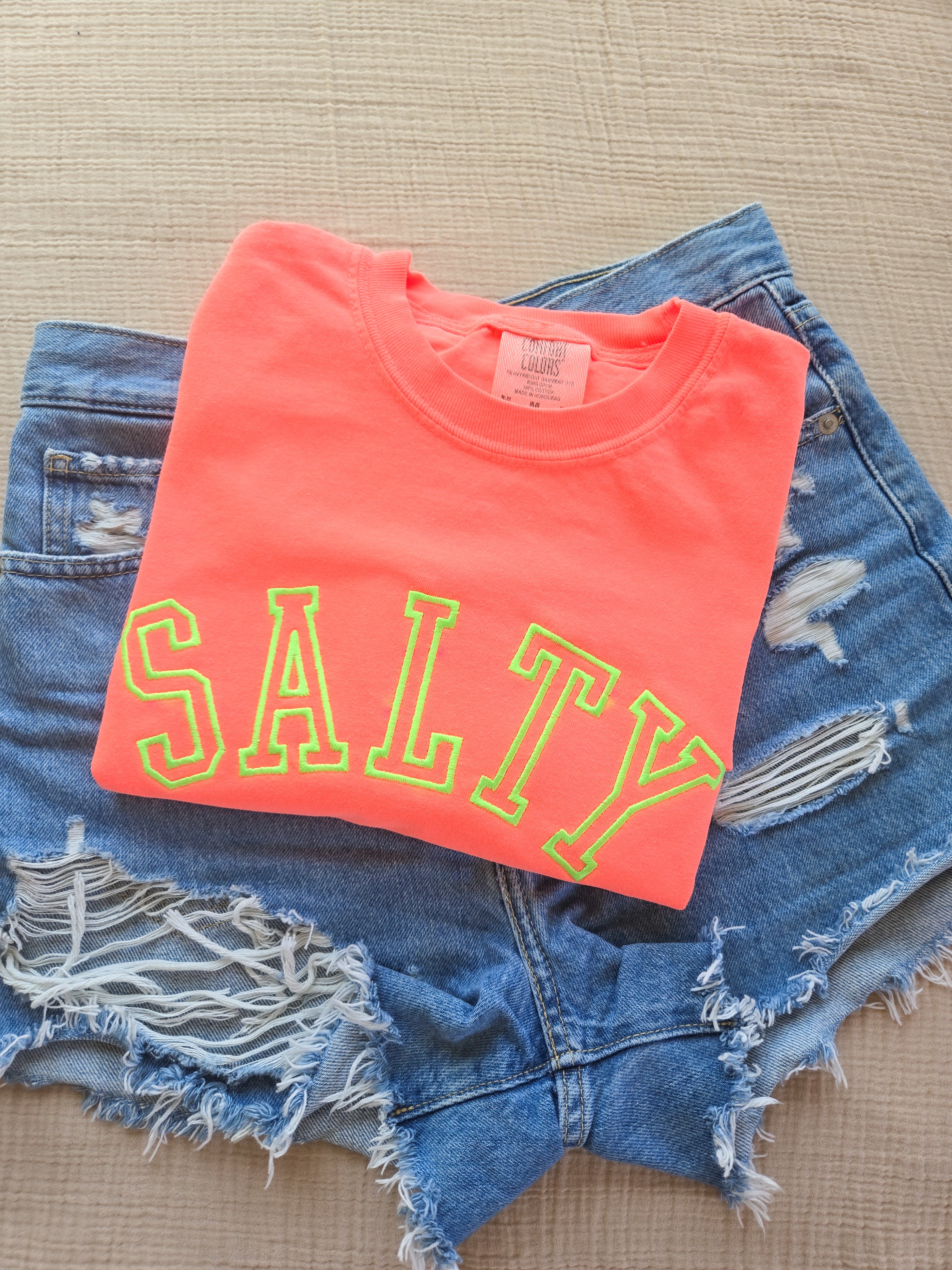 This varsity-style Salty embroidered tee is stitched on a soft, garment-dyed Comfort Colors shirt—perfect for laid-back summer days. A fun and bold design that’s a must-have for beach lovers and sunny adventures!