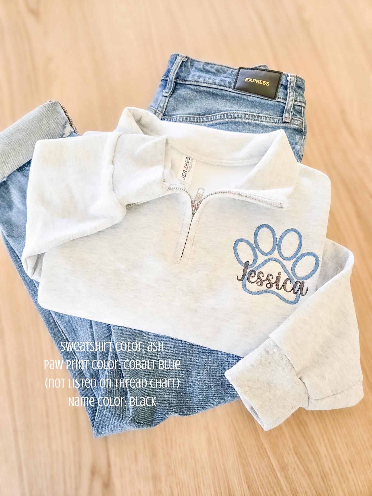 Custom quarter zip sweatshirt made with a paw print and name. Great gift for a new vet tech. Choose from many different thread colors!