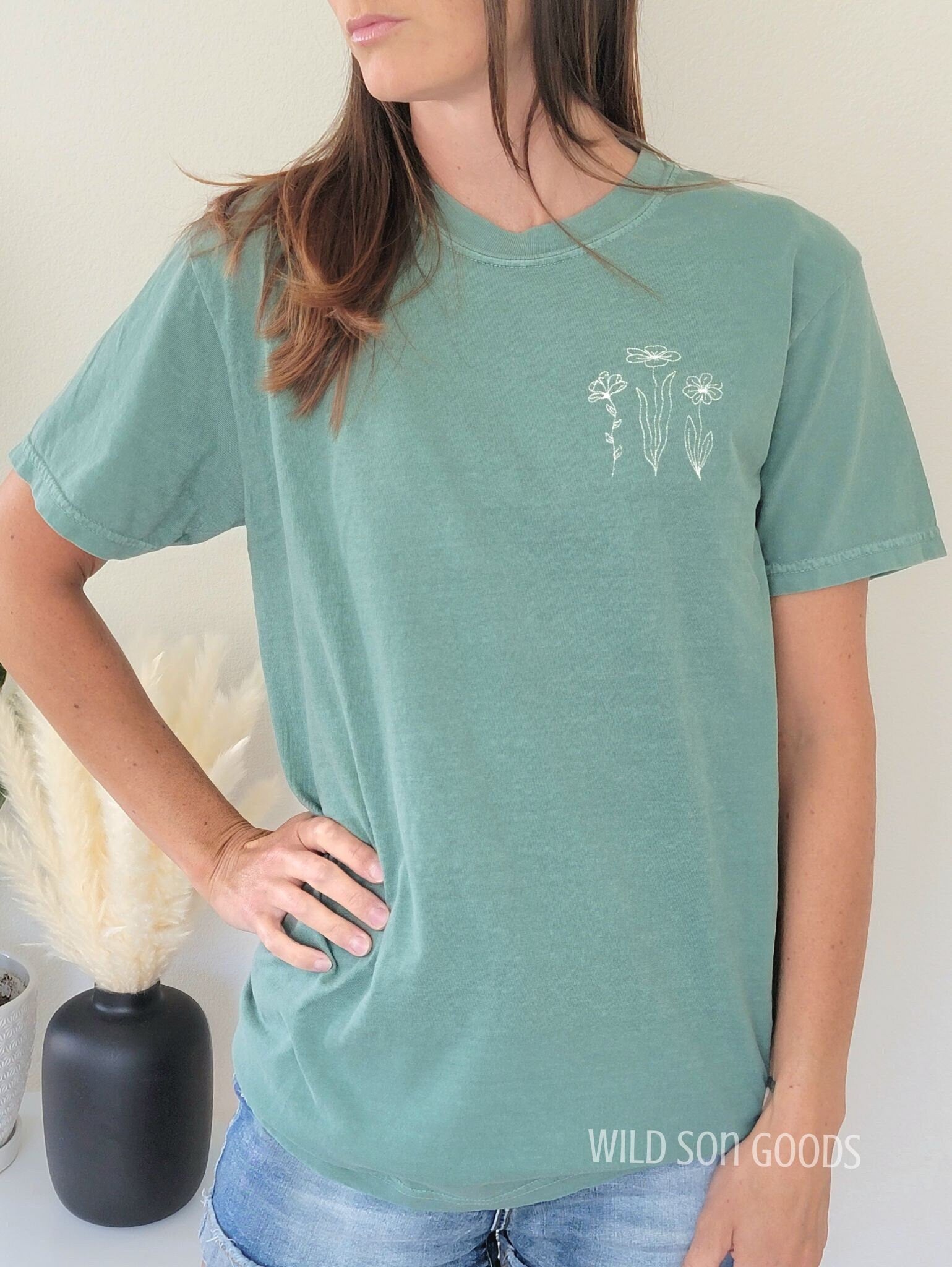 Comfort Colors t-shirt with simple wildflower embroidered design.